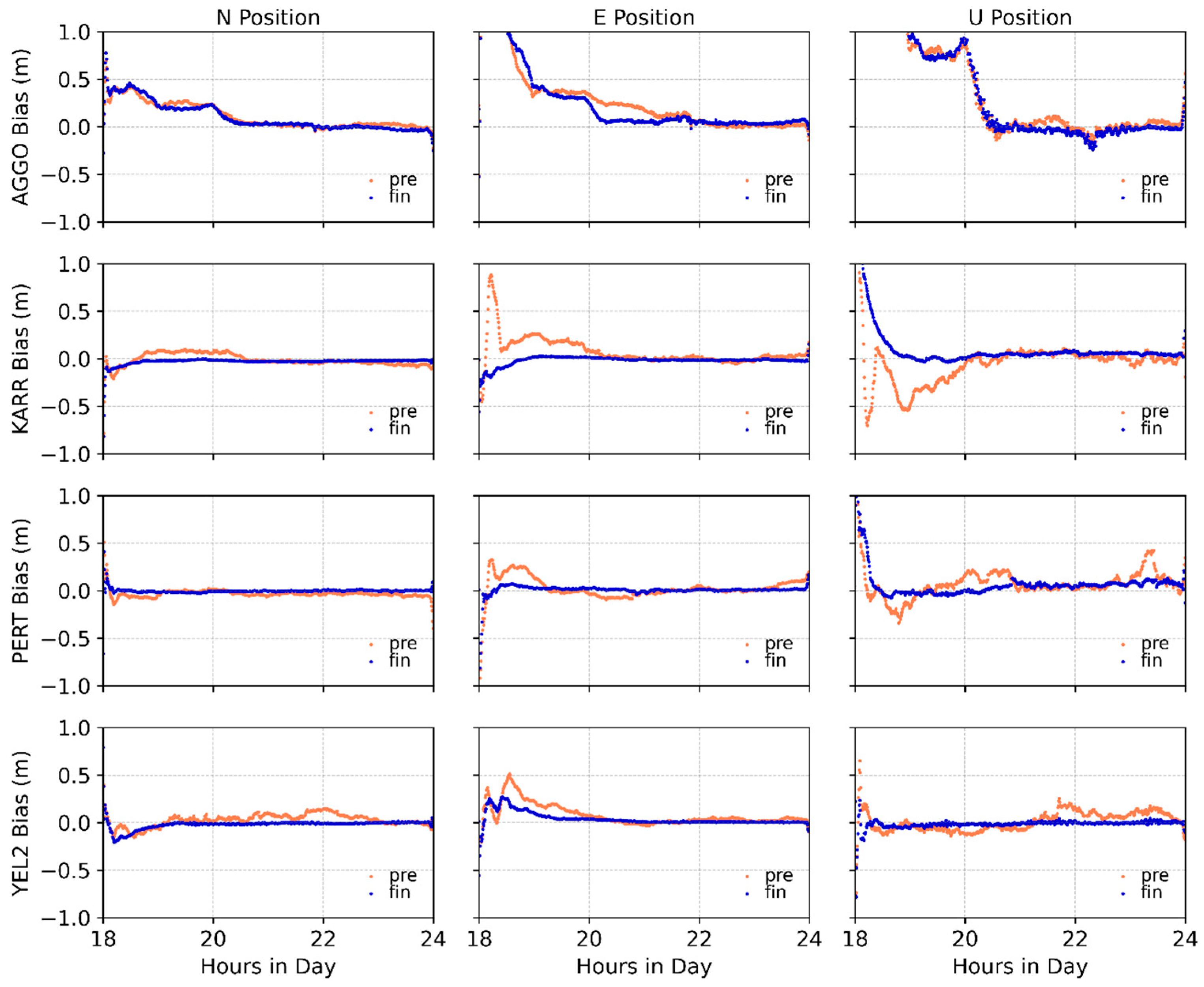 - Finally, we conducted simulated real-time PPP experiments using predicted SCB data and post-processed SCB products over the same time period, performing kinematic PPP data processing for 30 selected globally distributed IGS tracking stations. Experimental results demonstrate comparable positioning accuracy between the predicted data and post-processed products in the N, E, and U directions, confirming its suitability for positioning applications.