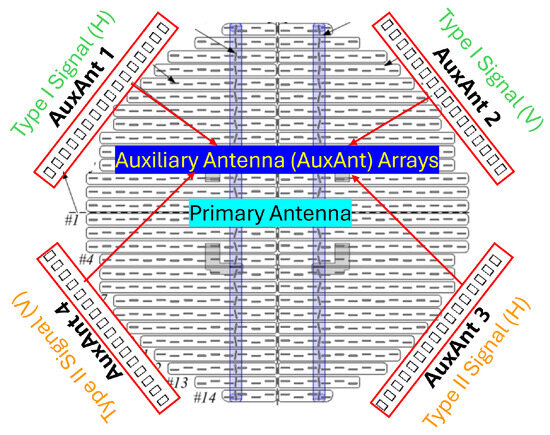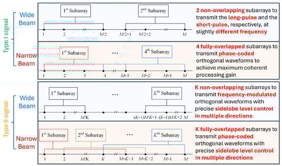 The signaling strategy is illustrated in Figure 3. If the scan update frequency is the priority and a wide beam is required, the phased-MIMO array AuxAnt 1 and 2 are divided into two non-overlapping subarrays to transmit FM waveforms in long pulses and short pulses, respectively, so that the blind zone is minimized while maintaining a balance between the maximum detection range and resolution [25,27]. To reduce range sidelobes, the induced echo signals go through the APC branch rather than conventional matched filter [18,19,20]. In the case that sensitivity and angular resolution are the priorities and a narrow main beam is required, AuxAnt 1 and 2 are partitioned into four fully overlapped subarrays to transmit PC orthogonal waveforms, with each subarray consisting of antenna elements.