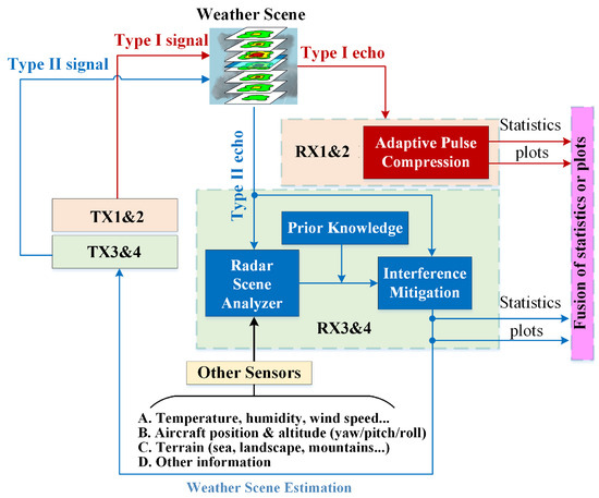 The Type II signal transmitted by AuxAnt 3 and 4 is determined by the data collected by other sensors that are used as the input for the radar scene analyzer (RSA) and other prior knowledge so that the transmit beampatterns have specific sidelobe levels at certain directions for interference suppression. These data include (a) meteorological information, such as the temperature, humidity, and zonal/meridian/vertical wind speed; (b) aircraft kinemics, such as the position of the aircraft and the attitude (yaw/pitch/roll); (c) the terrain (i.e., sea, landscape, mountains, etc.), from which statistical properties are derived; and (d) other information, such as the data collected by the lightning sensor, turbulence probe, imaging sensor, and ground-based/satellite-based weather radars. By employing the proposed auxiliary antenna arrays, the beam scan strategy in the elevation domain becomes more flexible.