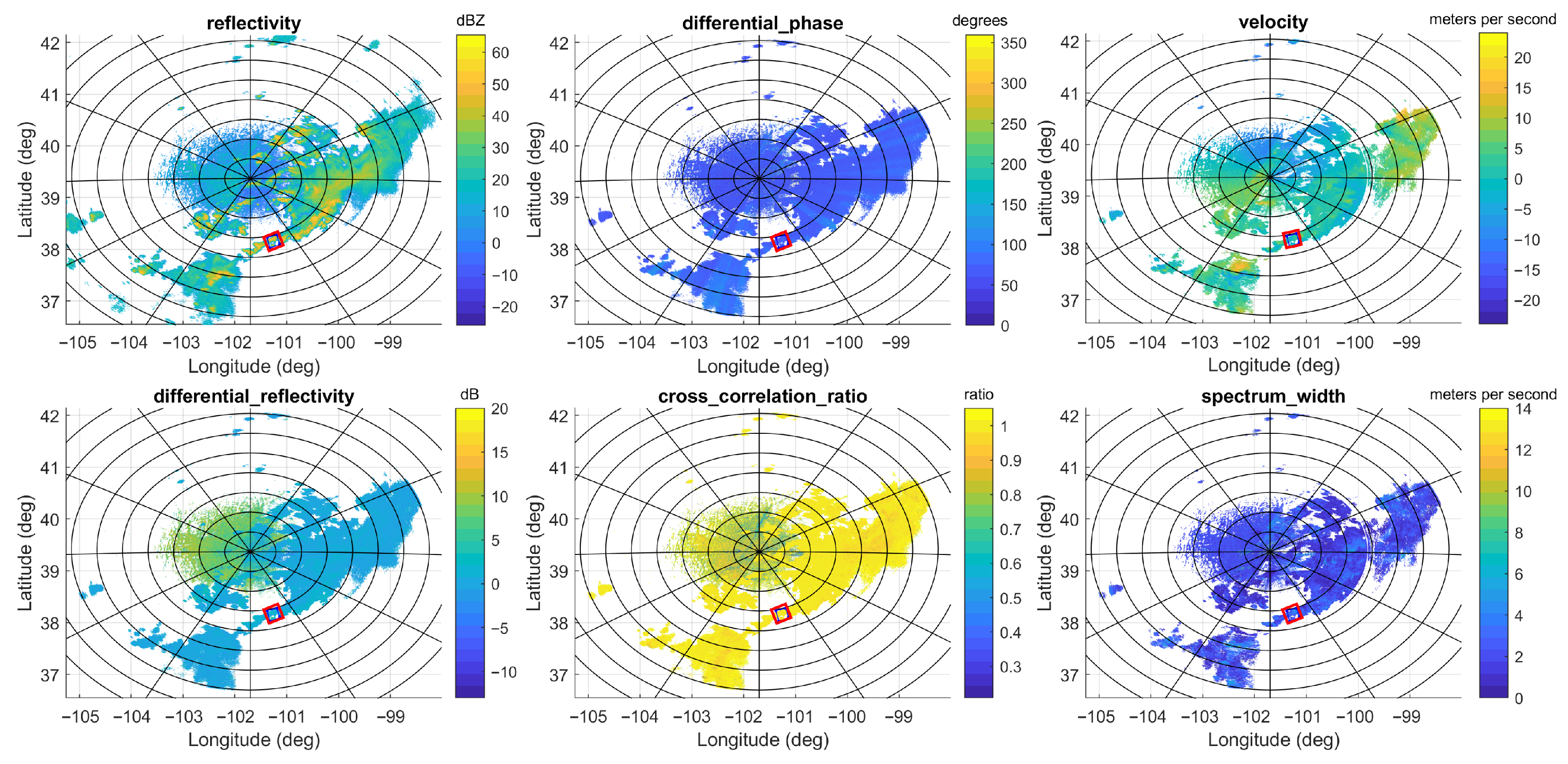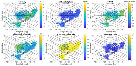 The primary variables of the dual-pol radar data collected by the WSR-88D dual-pol weather radar during precipitation occurring at 22:00 on 7 July 2021 in Goodland, Kansas, which include reflectivity, differential phase, radial velocity, differential reflectivity, cross correlation ratio, and spectrum width. The area in the red square corresponds to the ROI.