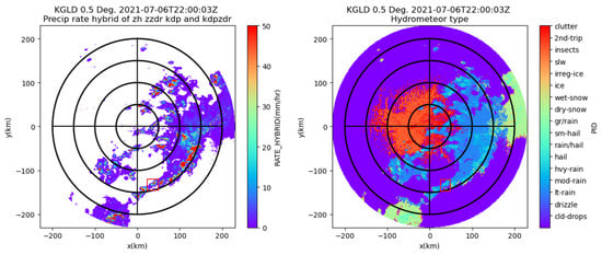 Due to the lack of avionic weather radar data in the public domain, the data recorded by the ground-based WSR-88D dual-pol weather radar are used as the ground truth in this subsection. Specifically, we determine that the precipitation occurred at 22:00 on 7 July 2021 in Goodland, Kansas. The primary variables of the dual-pol radar data collected by the WSR-88D dual-pol weather radar at the KGLD site are illustrated in Figure 6, which include reflectivity, radial velocity, differential reflectivity, differential phase, and specific differential phase. The region of interest (ROI) is between N and N in latitude and and in longitude and is marked with a red square. The center of the ROI is 130 km south, 40 km east of the KGLD radar. The precipitation rate estimation result and the hydrometeor type prediction result based on the WSR-88D radar data are provided in Figure 7, where the area in the red square corresponds to the ROI.