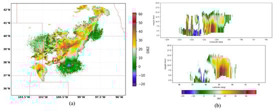 The column-max reflectivity data reconstructed by jointly exploiting the contributions made by three WSR-88D radars (the KGLD site in Goodland, Kansas; the KUEX site in Hastings, Nebraska; and the KDDC site in Dodge, Kansas) are illustrated in Figure 8a. Figure 8b illustrates the West–East (W–E) vertical section and the North–South (N–S) vertical section, respectively, corresponding to the location of the maximum dBz value. The geographical coordinates of the KUEX, KDDC, and KGLD radars are ( N, W), ( N, W), and ( N, W), respectively. The elevations of the KUEX, KDDC, and KGLD radars are 2057, 2671, and 3716 feet, respectively. The vertical axis has 31 levels from 1.5 km to 19 km in altitude, with 0.25 km spacing up to 3 km, 0.5 km vertical spacing from 3 to 9 km, and 1 km spacing from 9 to 19 km. Based on these data, precipitation is further classified as convective, mixed, and stratiform based on the Echo Classification from COnvectivity (ECCO) algorithm [42]. It can be seen from Figure 7, Figure 8 and Figure 9 that the ROI is experiencing a ConvDeep precipitation with mixed graupel, small hail, and rain, and the storm cell in this region varies dramatically with height.