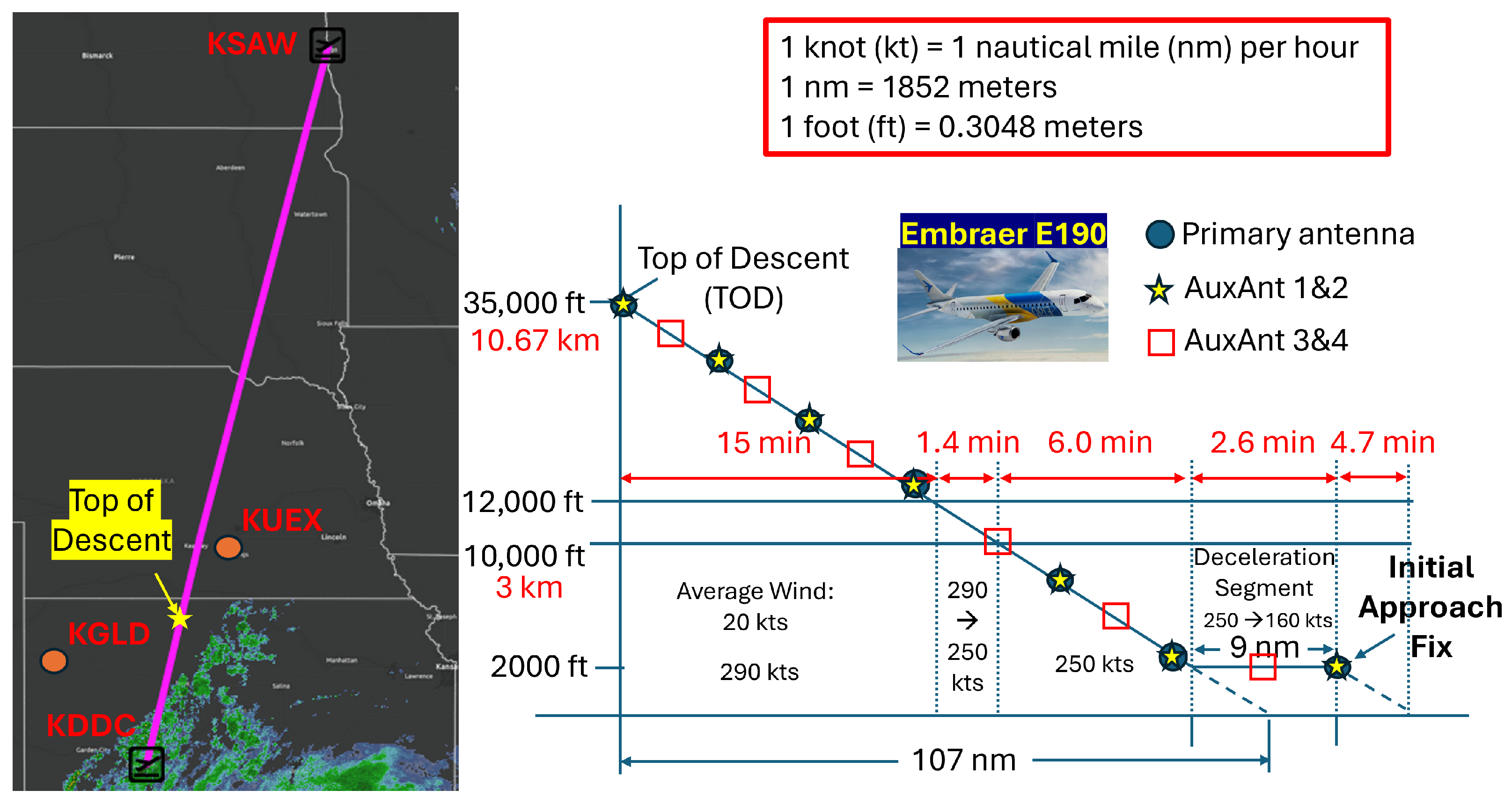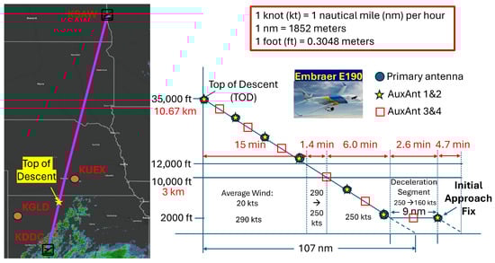 To demonstrate the advantage of the performance improvement brought by the dual-pol configuration, we consider the standard aircraft descent scenario illustrated in Figure 10, where a commercial aircraft is flying from the Hector International Airport (code: KSAW) in Fargo, North Dakota, to Dodge City Regional Airport (code: KDDC), Dodge City, Kansas. The total time duration of the descent is 30 min; the top of the descent is 116 nautical miles (215 km) from the destination and is marked with a star symbol on the left of Figure 10. The moving speed and altitude of the aircraft at different stages are marked on the right of Figure 10. To illustrate the working mechanism of the proposed auxiliary antennas, the antenna sweep schedules for the primary antenna, AuxAnt1 and 2, as well as AuxAnt 3 and 4 are depicted with blue circles, yellow stars, and red squares.
