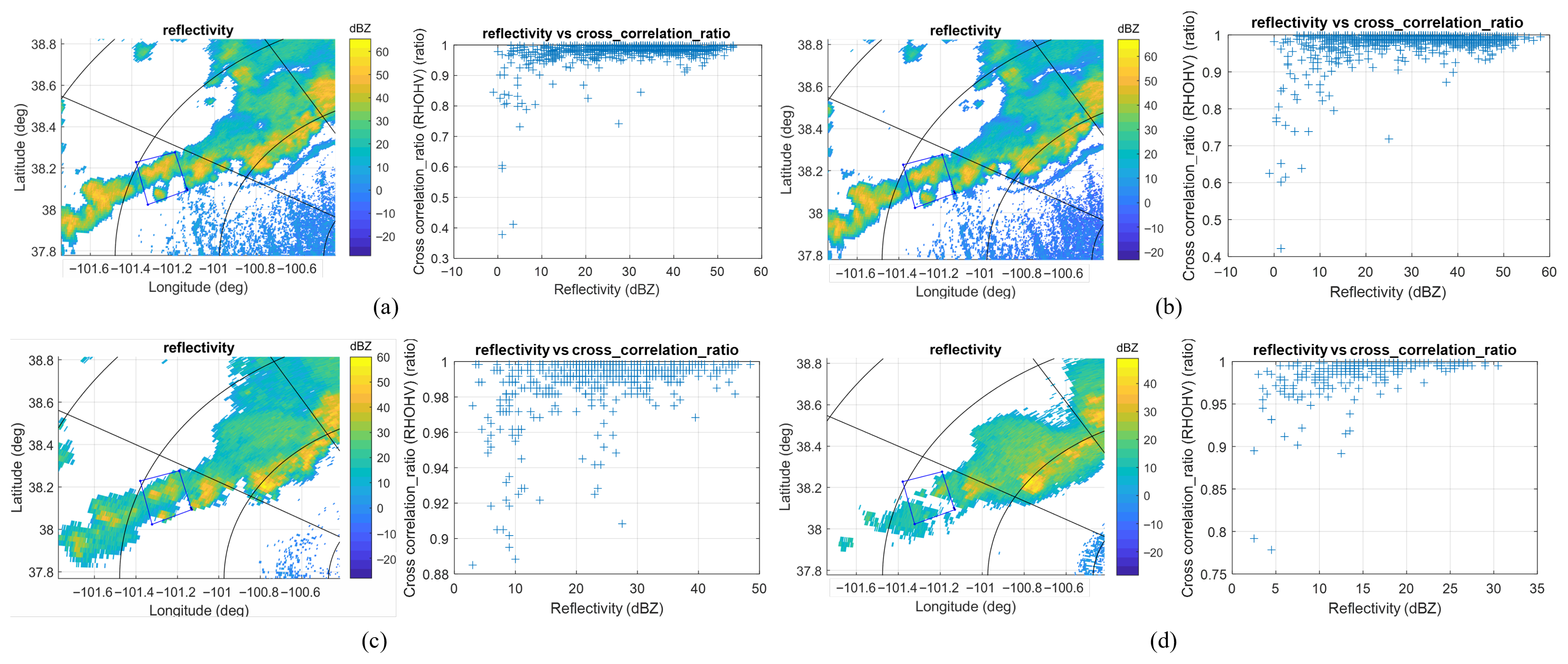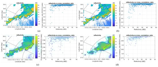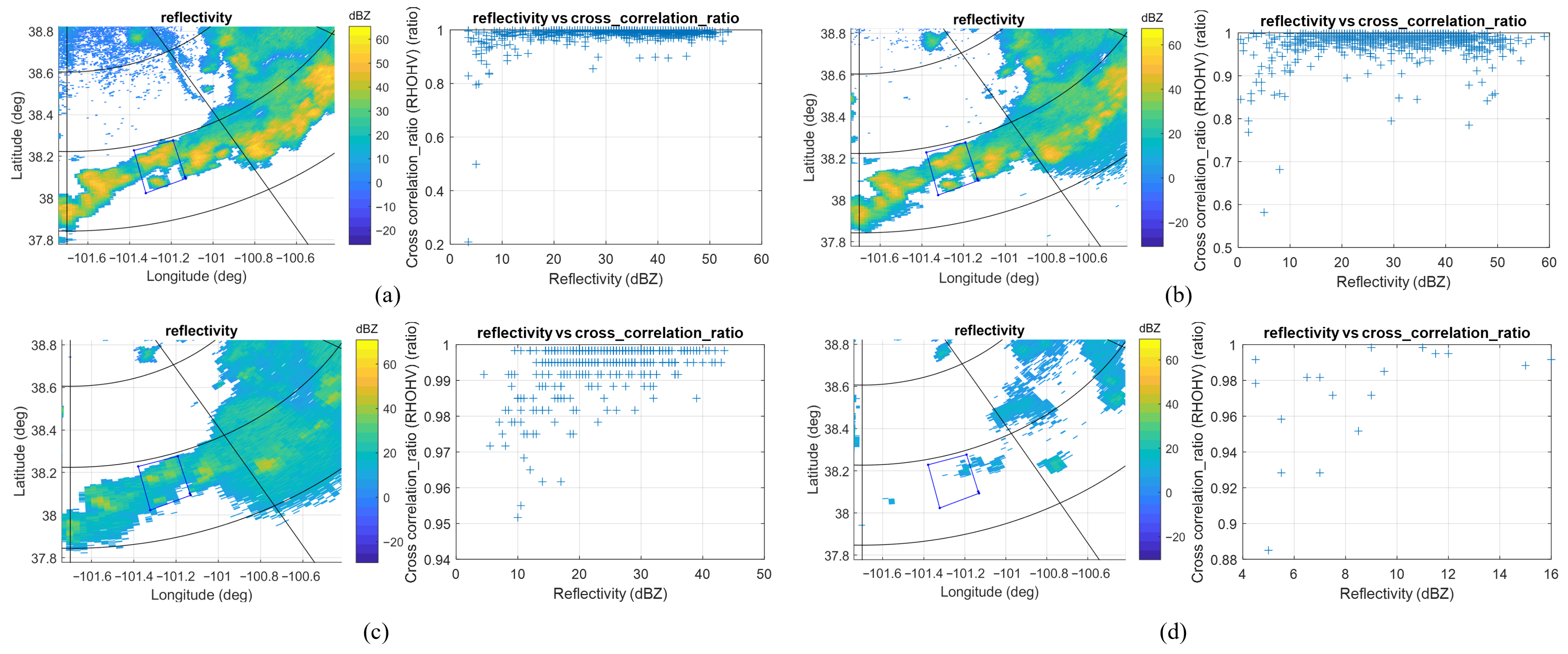 The reflectivity and cross correlation ratio for the ROI acquired by KGLD with different tilt angles. (a) KGLD at 22:00:03, tilt = 0.5°. (b) KGLD at 22:01:28, tilt = 1.3°. (c) KGLD at 22:02:23, tilt = 2.4°. (d) KGLD at 22:02:49, tilt = 4°.