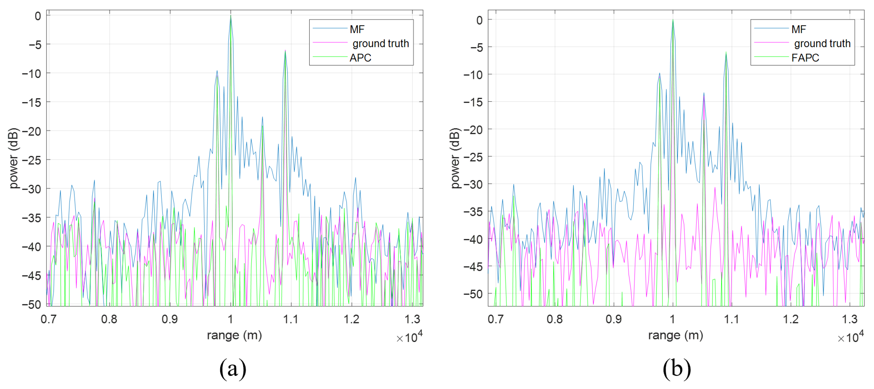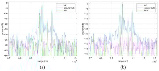 The range sidelobe suppression performances of the APC algorithm and the FAPC are depicted in Figure 15a and Figure 15b, respectively, where four point targets are simulated. It can be seen that, if only the MF is implemented, strong range sidelobes could be easily mistaken as targets, while the weak targets are buried in the range sidelobes of the adjacent stronger targets. Once the APC or the FAPC algorithm is implemented, the range sidelobes are efficiently suppressed, and the previously buried weak target is revealed.