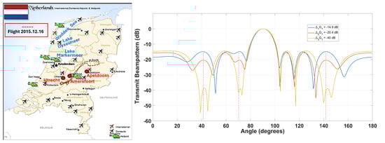 The aircraft trajectory during the data acquisition campaign conducted on 16 December 2015 during the X-Wald project with a flight height between 250 m and 550 m is depicted by the dash-dotted line on the left of Figure 16. It can be seen from the left side of Figure 16 that the flight trajectory chosen for the data acquisition campaign covers an area full of interferences. Specifically, helicopters often buzz above Amersfoort for law enforcement, emergency services, and infrastructure maintenance, and the Onze Lieve Vrouwetoren church tower at Amersfoort is about 100 m high. Moreover, it is clear that aircrafts in the northern part of the Netherlands need to frequently fly over water bodies (Wadden sea, Lake IJsselmeer, and Lake Markermeer), where cargo ships and small vessels come and go. Transmitting wide/narrow beams with predetermined sidelobe levels in multiple directions during each radar pulse based on contextual information provided by the on-board ground terrain database is not only beneficial for excluding heavy cluttered areas with intense inner clutter motion (ICM) and strong discrete clutter during data acquisition, but also for limiting the interferences from the weather radar to other electronic devices. The right side of Figure 16 depicts two transmit beams with predesignated sidelobe levels (SSLs) in four directions formed by a phased-MIMO antenna array consisting of 16 elements that are divided into fully overlapped subarrays (i.e., 14 elements in each subarray). By comparing the difference between the target echoes associated with the two waveforms, the SSLs for the next pulse could be adjusted accordingly.