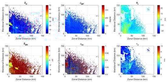 Since the major purpose of this work is to demonstrate the advantages that could be brought about by the proposed antenna architecture and signaling strategy rather than developing an avionic weather radar simulator, ground-based weather radar data collected by NEXRAD have been used for functional verification. In 2024, Matlab® R2024a introduced a built-in function weatherTimeSeries that can generate time series I/Q signals for polarimetric weather radars based on the polarimetric weather variables. The radar return from a specific resolution volume is modeled as a complex stationary Gaussian random process and Monte Carlo simulation is used. To verify the fidelity of the simulated I/Q signals, the polarimetric variables contained in the data collected by the KGLD radar at 22:00:03 on 7 July 2021 with a tilt angle of covering an area of 0–90° in azimuth and 10 km to 200 km in range are shown in Figure 17.
