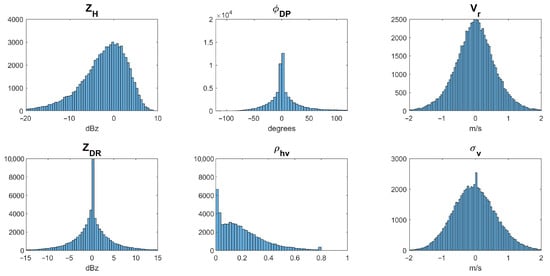 The distribution of estimation errors for six dual-pol radar variables, which are obtained by subtracting the NEXRAD ground truth from the Pulse-Pair Processing (PPP) estimates of each radar moment, is illustrated in Figure 18. It can be seen that the estimation errors are within an acceptable range, which indicates that a full simulation could be carried out in future works, as illustrated in Figure 19, where “G-WXR” and “A-WXR” represent ground-based and avionic weather radars, respectively, and “WOR” and “COR” represent weather observation regions and clutter observation regions illuminated by the radar beam, respectively.