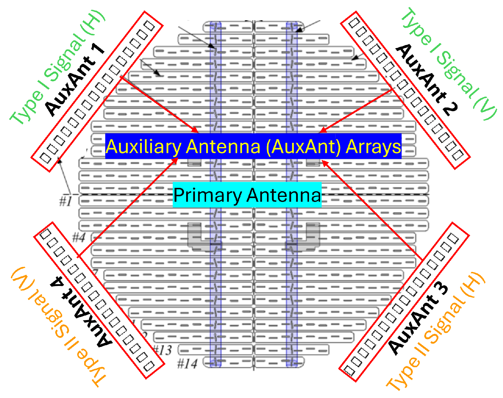 Four auxiliary antenna (AuxAnt) arrays are added to the existing avionic weather radar antenna. AuxAnt 1–4 are all based on the phased-MIMO technique, and provide extra waveform design and beamforming flexibility.