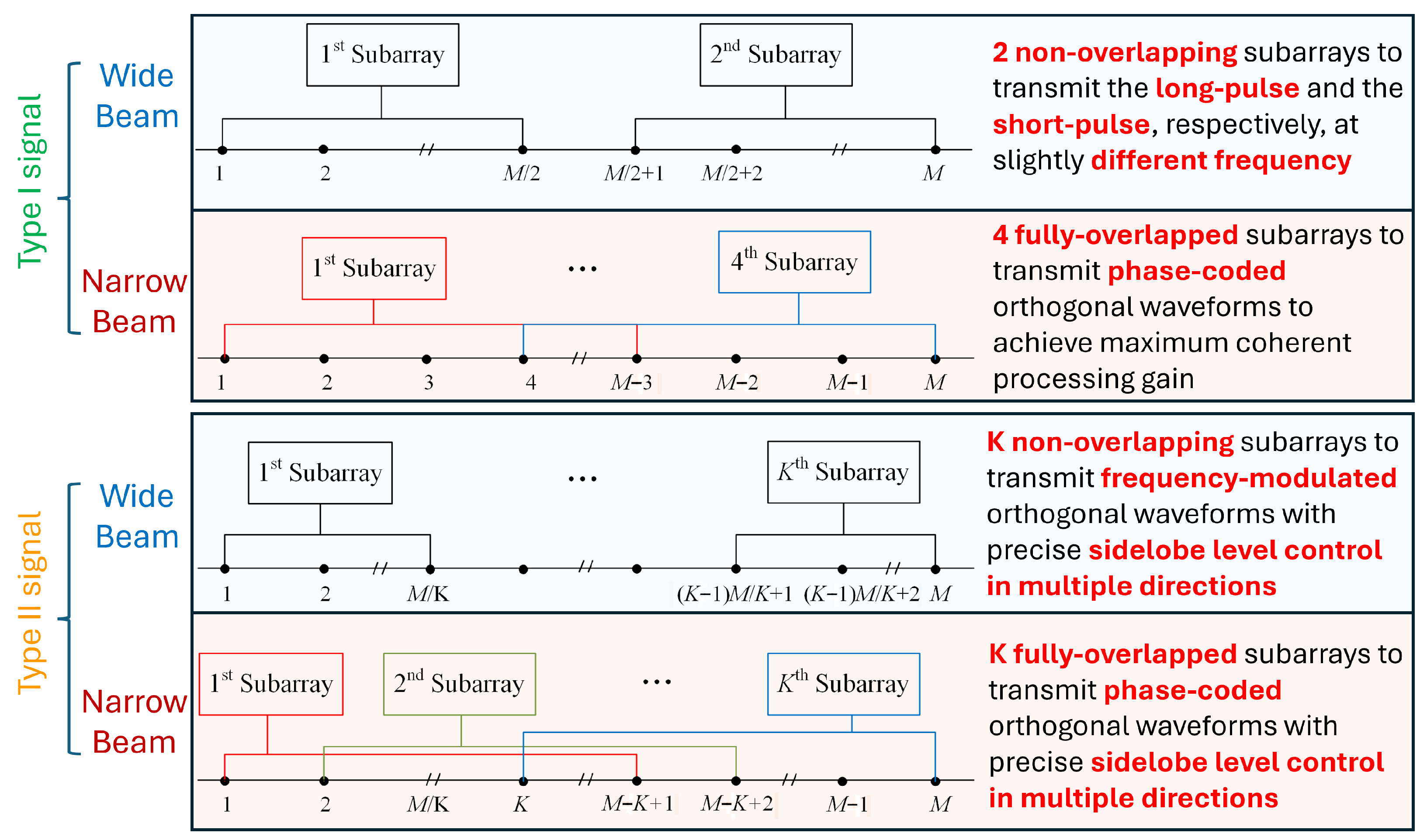 In comparison, the Type II signal transmitted by AuxAnt 3 and 4 is automatically generated based on the contextual information and the principle of complementariness within the framework of cognitive radar [28]. For example, if the beams transmitted by AuxAnt 1 and 2 are pointed forward, then the beams transmitted by AuxAnt 3 and 4 are steered to a depression angle of 30° hence the terrain information is fed to AuxAnt 3 and 4 for ground clutter suppression. For the transmission of a wide main beam covering the spatial sector with precisely controlled sidelobe levels in certain directions, AuxAnt 3 and 4 are divided into K non-overlapping subarrays transmitting FM signals that are separated in frequency, so that the signals could be separated at the receiver to exploit the waveform diversity gain. For the transmission of a narrow main beam pointing at with predetermined sidelobe levels in multiple directions during one radar pulse, AuxAnt 3 and 4 are divided into K fully overlapped subarrays transmitting PC signals to exploit the coherent processing gain.
