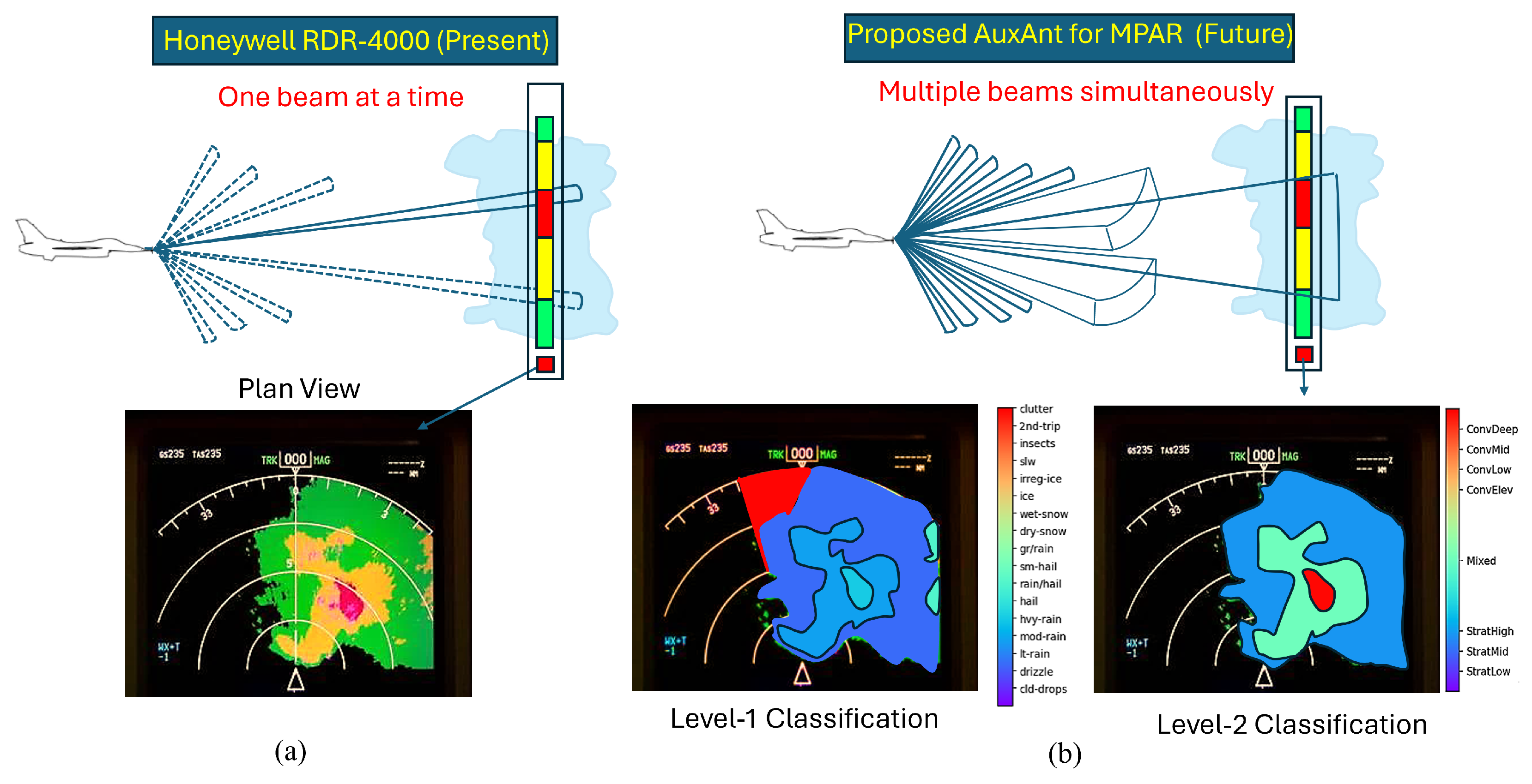 The advantage of the proposed AuxAnt for MPAR over the conventional weather radar. (a) Honeywell RDR-4000. Four colors (green, yellow, red, magenta) are used to represent four radar signal levels; weather classification is not available. (b) Avionic radar with the proposed AuxAnt and signaling strategy, which enables accurate weather classification.