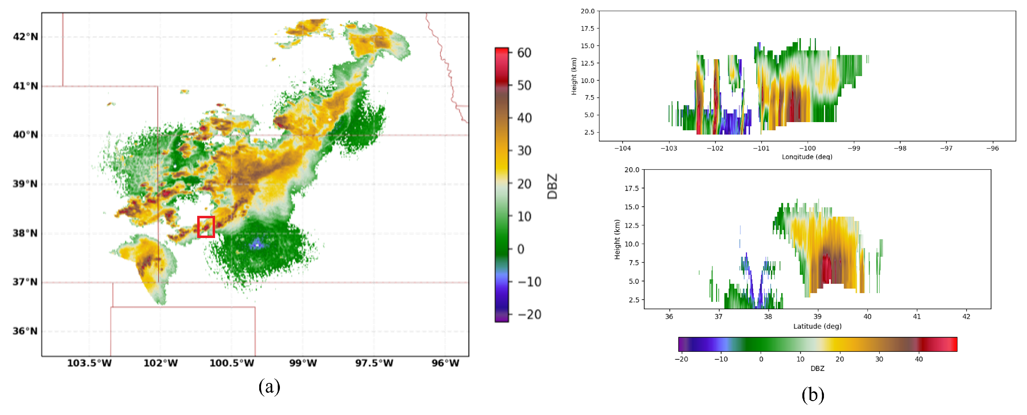 The 3D reflectivity data reconstructed by jointly exploiting the contributions made by three WSR-88D radars and the vertical sections. (a) The 3D reflectivity data. (b) Longitude/latitude cuts. The area in the red square corresponds to the ROI.