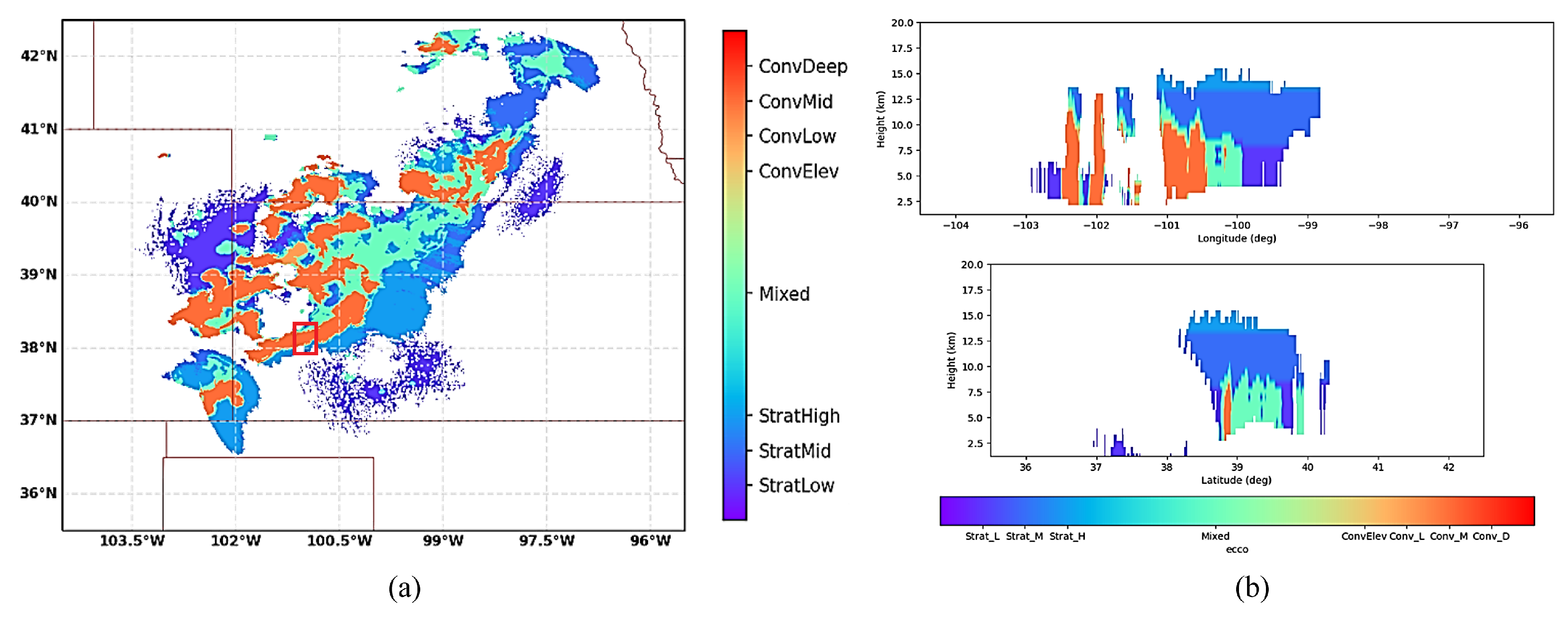 Precipitation classification results obtained with the ECCO algorithm. (a) Horizontal plane. (b) W-E and N-S vertical sections corresponding to the location of the maximum dBz value.