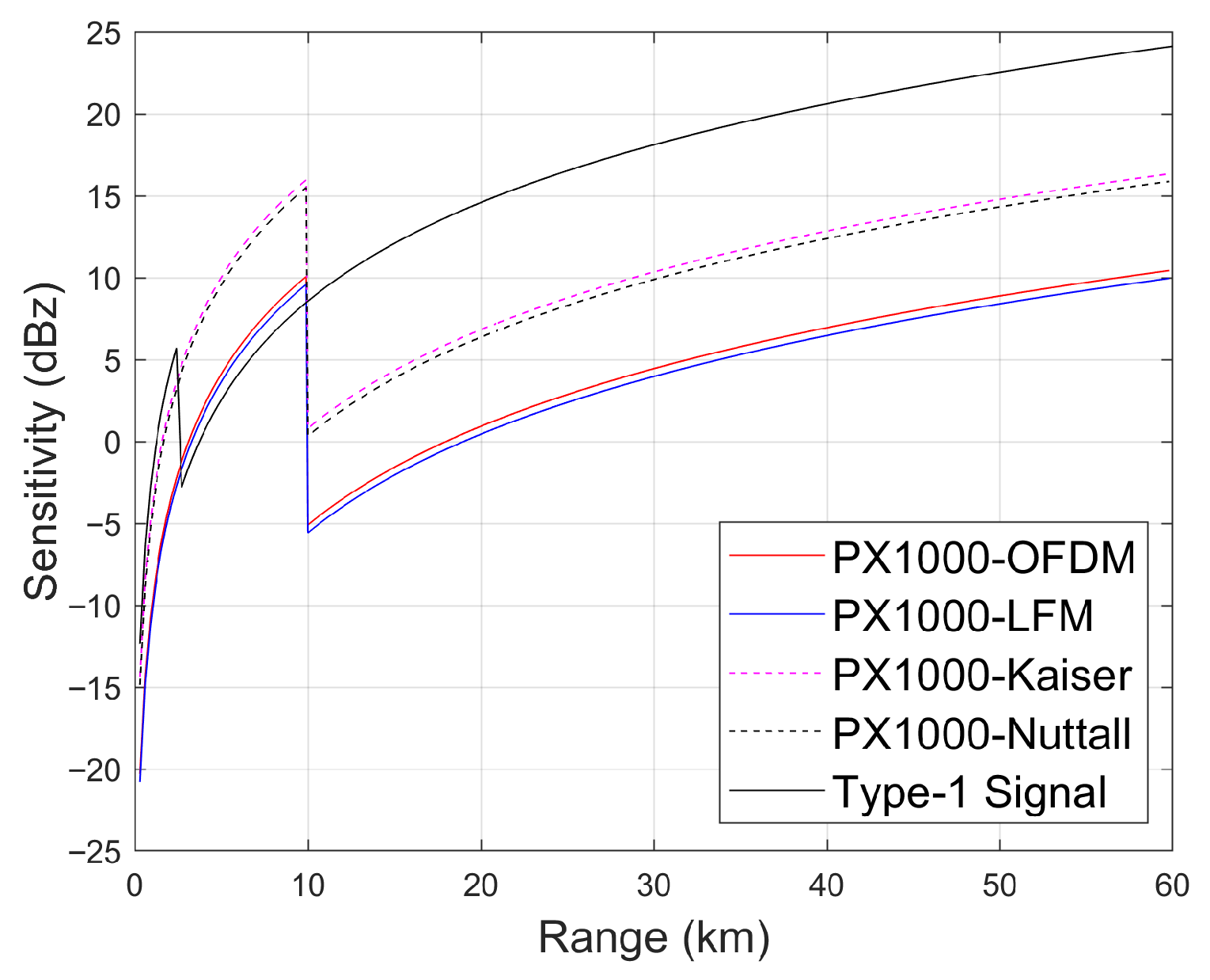 The key parameters of the WXR-2100 MultiScanTM, the IntuVue®(RDR-4000), the PX1000, and the proposed X-band airborne weather radar are compared in Table 4. WXR-2100 MultiScanTM was developed by Rockwell Collins Inc., headquartered in Cedar Rapids, IA, USA (now part of the Collins Aerospace Inc. after the 2018 merger), in 2013 [15]. IntuVue®(RDR-4000) was manufactured by Honeywell Aerospace Inc., Phoenix, AZ, USA in 2012 [1]. PX1000 is a solid-state software-defined weather radar developed by Advanced Radar Research Center, University of Oklahoma, Norman, OK, USA between 2008 and 2012 [24]. It has twin independent transmit-receive chains (i.e. independent up-down converters and power amplifiers) so that each channel can transit different waveforms. The sensitivities of these radars are compared in Figure 13. Note that the abrupt sensitivity changes at 1.8 km and 10 km correspond to the blind range for the proposed radar and the PX1000 operating with interlaced long–short pulses, respectively. Based on the theoretical sensitivity comparison results presented by Kurdzo et al. [25], for the PX-1000 radar, which has a noise floor of −110 dBm, an abrupt change in sensitivity is observed at 10 km, which corresponds to the blind range for the long pulse, due to the employment of a short (fill) pulse. Since the short pulse has a pulse width of 2 s and a bandwidth of 2.8 MHz and the long pulse has a pulse width of 67 s and a bandwidth of 2.2 MHz, the sensitivity values provided by these two types of pulses are 15 dBZ and 0 dBz, respectively, under the assumption of a non-windowed LFM waveform.