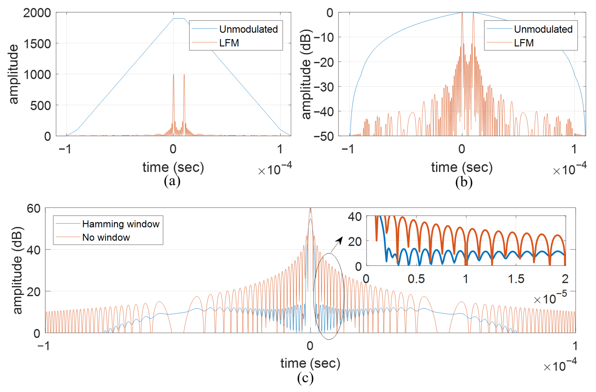 Pulse compression is a widely adopted technique to resolve the dilemma between range resolution and the effective transmit power, which are proportional and inversely proportional to the pulse width, respectively, in the case where an unmodulated rectangular pulse train is used. Figure 14a,b illustrate the advantage of the LFM waveform over the unmodulated pulse train in discerning two closely located targets. The time–bandwidth product used for simulation is 100, with pulse width and bandwidth set as 100 s and 1 MHz, respectively. Since the two targets are 10 s apart (1/10 of the pulse width) in the time delay for radar echoes, they are mistaken as a single target given that the unmodulated pulse train is used, but are separated when the LFM waveform is used. Since the peak-to-sidelobe-level ratio (PSLR) of the vanilla LFM waveform is far from satisfactory, extra sidelobe suppression is often required. Figure 14c depicts the sidelobe suppression performance by applying the Hamming window in the time domain.