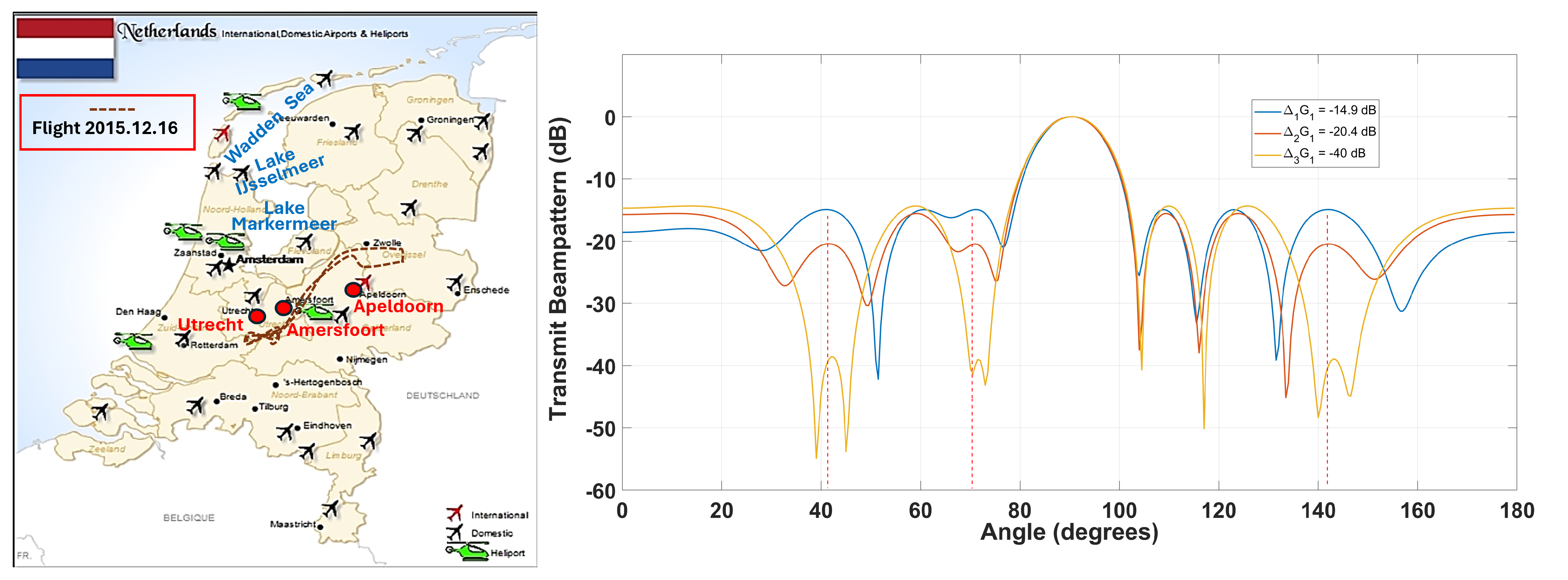 Adaptive interference mitigation over different types of terrains with sidelobe control. (Left): distribution of airports across the Netherlands. (Right): three transmit beams with predesignated SSLs in four directions formed by a phased-MIMO antenna array with 16 elements that are divided into fully overlapped subarrays during one pulse. By comparing the difference between the target echoes associated with the two waveforms, the SSL for the next pulse could be adjusted accordingly.