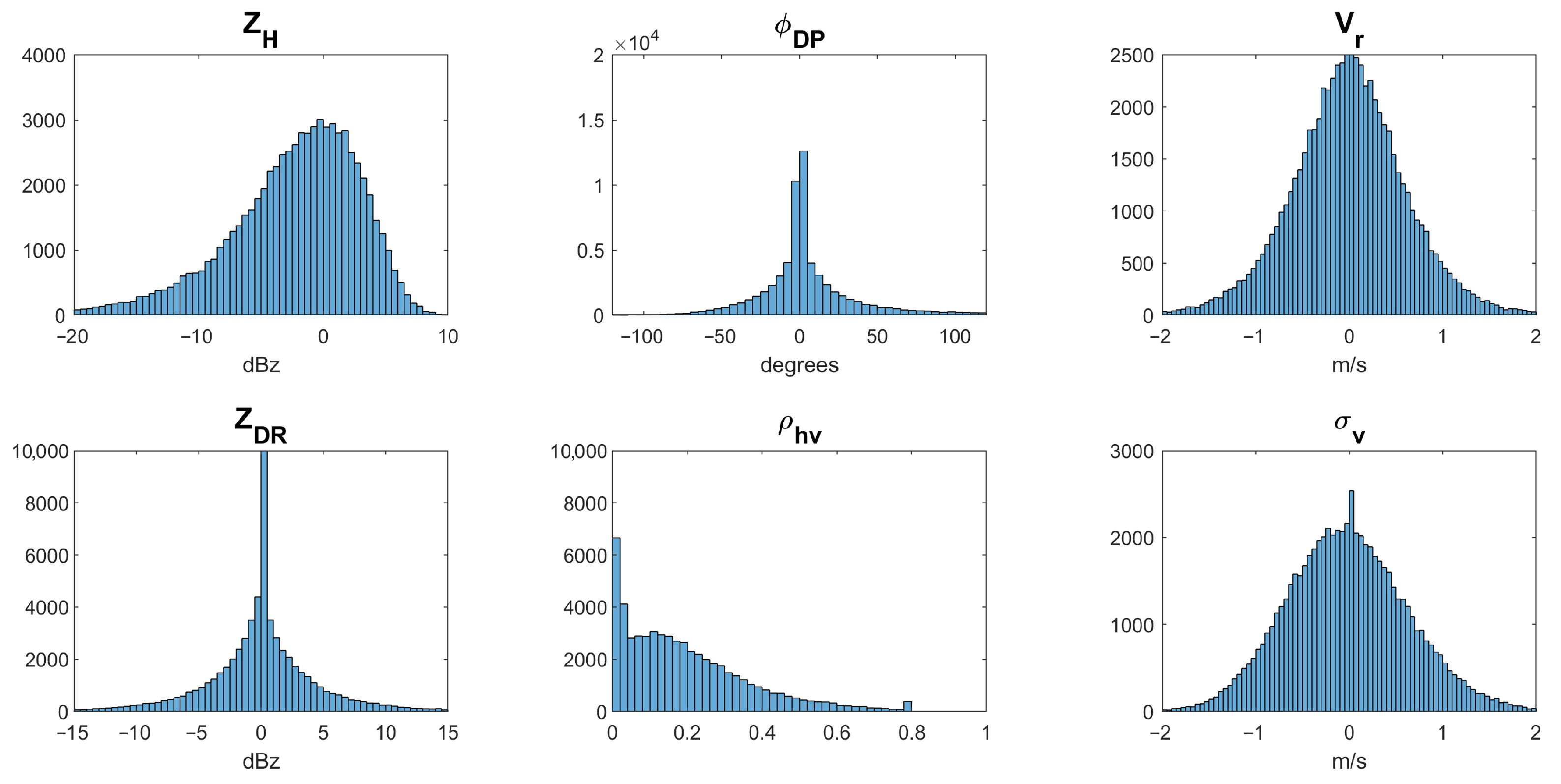 The distribution of estimation errors for six dual-pol radar variables.