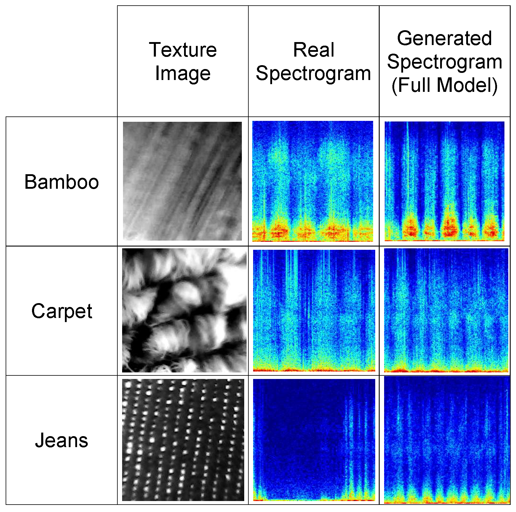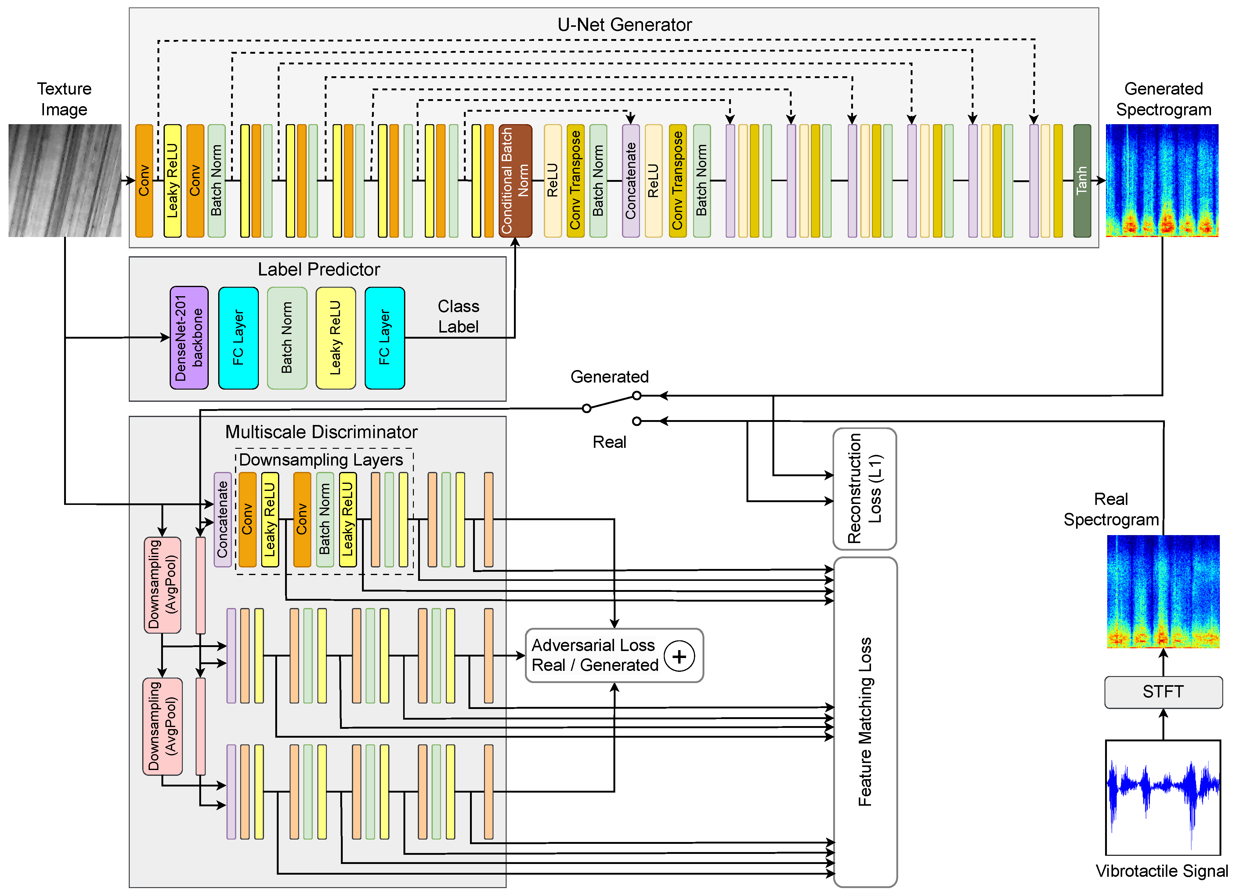 - Training with Weakly Paired Data: The same texture may correspond to multiple spectrograms within a class, creating challenges in precisely reconstructing the target spectrogram. While this results in some imprecision in the generated spectrograms, this isn’t a significant issue. The vibrotactile sensation for materials within a given class should remain similar, allowing a person to experience a consistent tactile sensation when touching the material, even if the exact spectrogram varies.