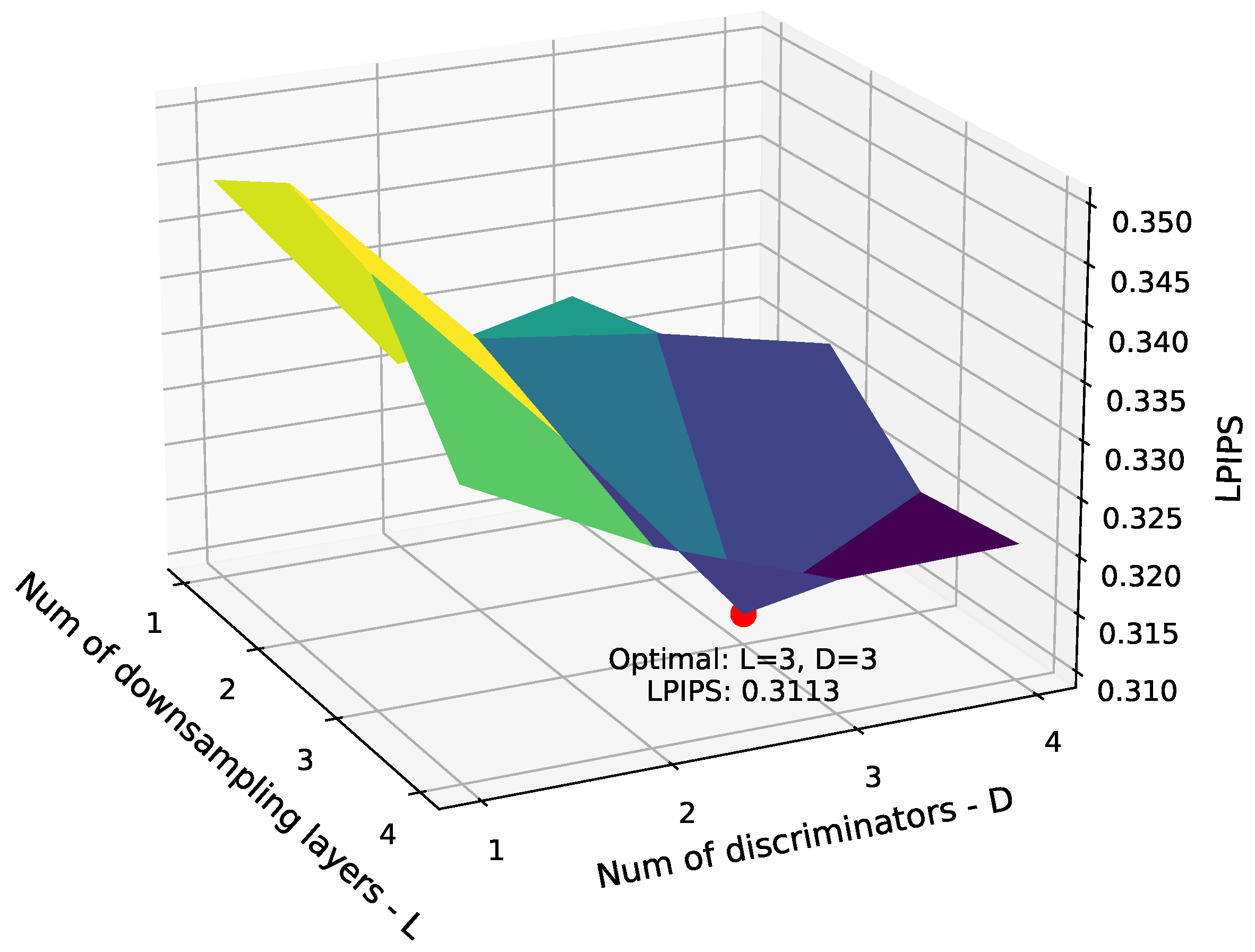 | Num of discriminators (D) | 1 | 0.3442 ± 0.0106 | 0.3486 ± 0.0099 | 0.3458 ± 0.0080 | 0.3337 ± 0.0084 |