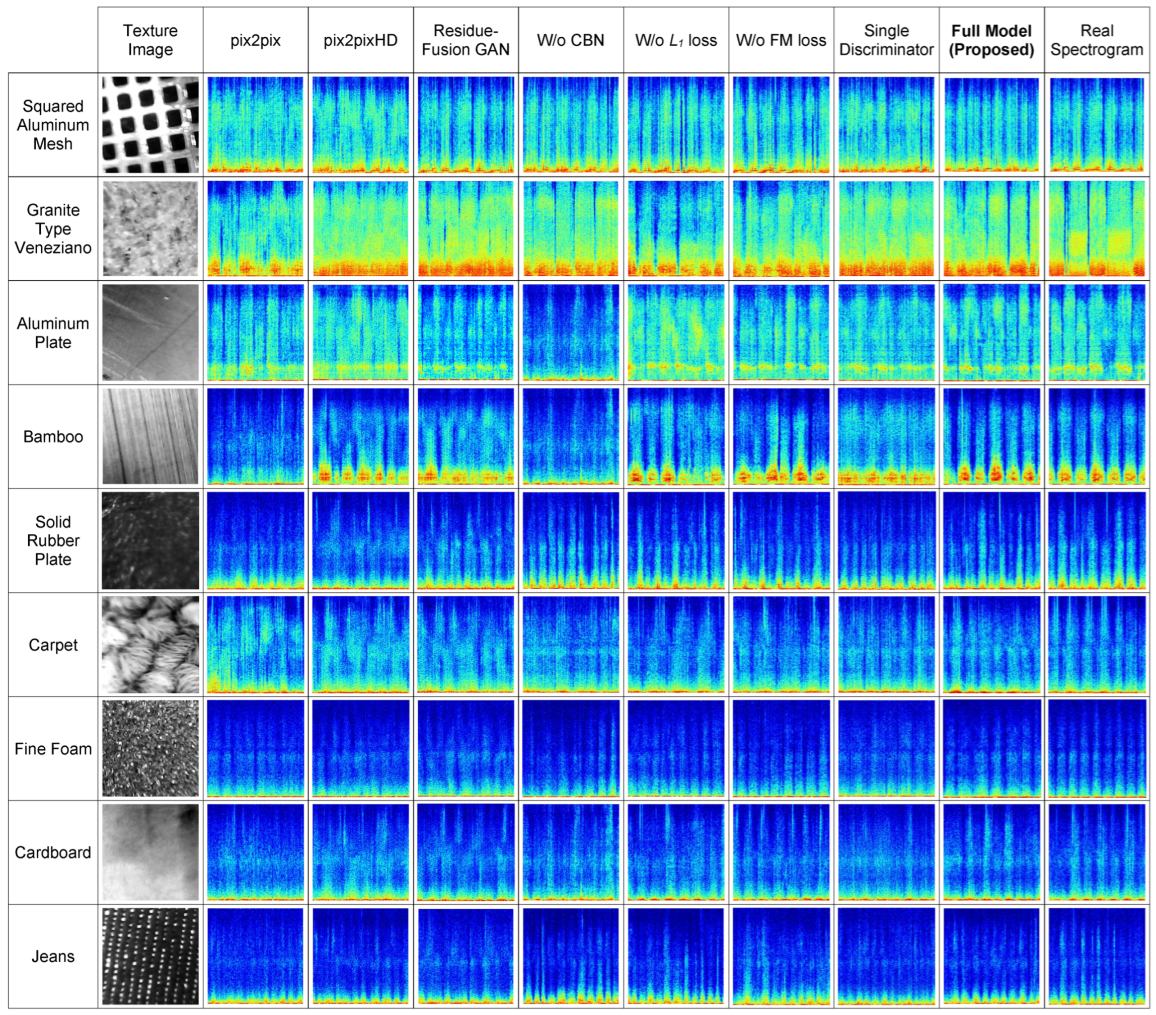 - An extensive evaluation was conducted on samples from 9 materials in the LMT-108 Surface-Materials dataset [25], including qualitative inspection of real vs. generated spectrograms and quantitative assessment using the LPIPS and FID metrics. The results demonstrate superior performance compared to three baseline models (pix2pix, pix2pixHD, and Residue-Fusion GAN), as well as several ablated variants. Ablation studies focus on the impact of removing loss, FM loss, and using a single discriminator, highlighting the contribution of each component to the final performance. Each experiment was repeated 10 times to ensure robustness. Two-sided paired t-tests comparing the proposed method to each baseline and ablated variant confirmed the statistical significance of the improvements. Representative failure cases are also discussed to highlight remaining challenges.