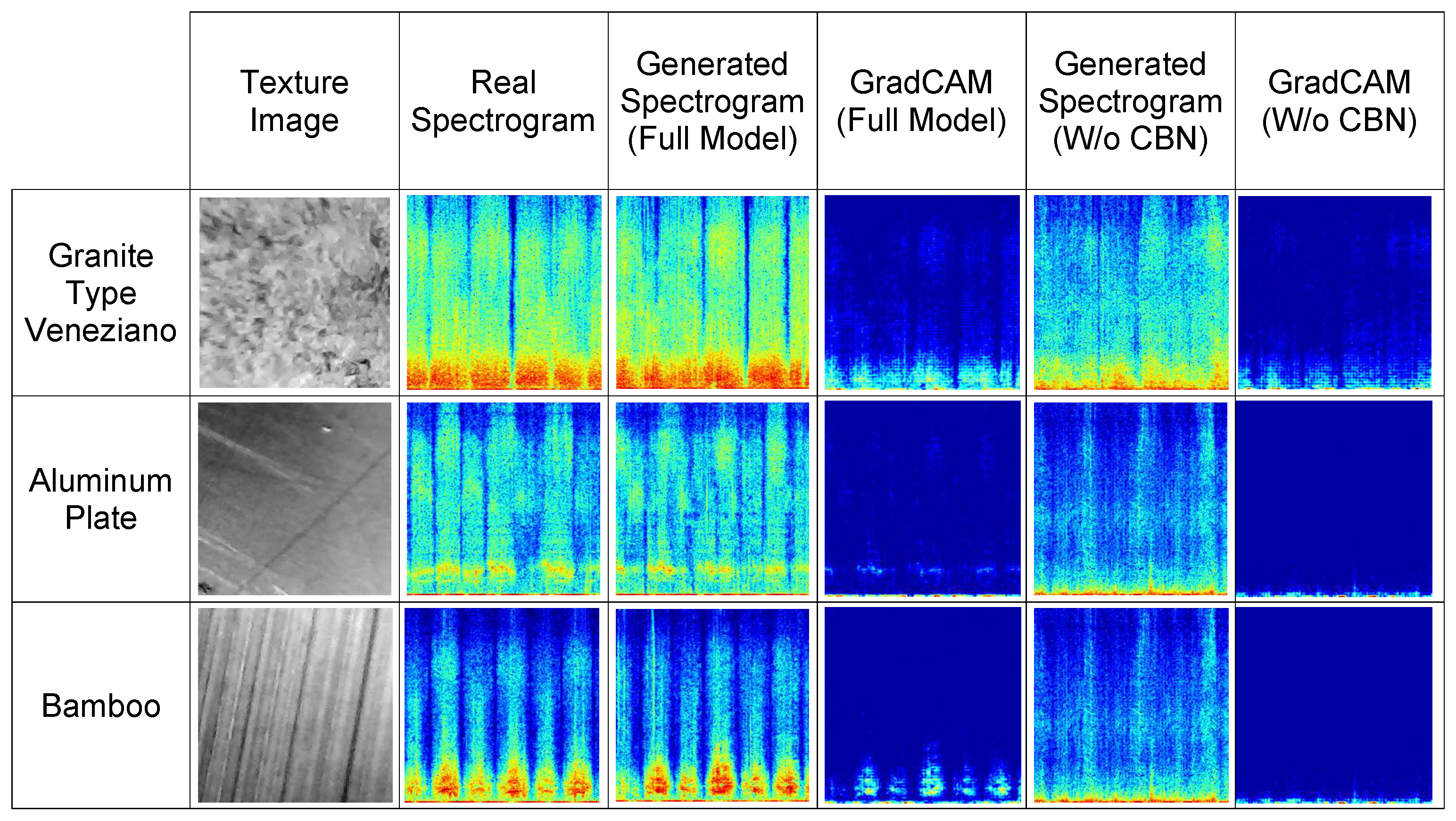 - A class-conditional GAN architecture is proposed for generating vibrotactile spectrograms from texture images of material surfaces. The generator is adapted from pix2pix [18], while the discriminator follows the multiscale structure of pix2pixHD [19]. An optimal configuration with three discriminators and three downsampling layers was determined through grid search. Class conditioning is implemented via Conditional Batch Normalization (CBN) [24] at the generator’s bottleneck, based on the material label predicted by a separately trained classifier. The effectiveness of this approach is further illustrated using GradCAM visualizations.