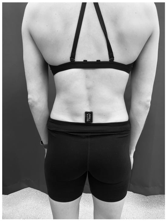 The skin-mounting method consisted of using double-sided hypoallergenic sticky tape to attach the accelerometer to the participants’ lumbar spine in the L4–L5 region (see Figure 1).