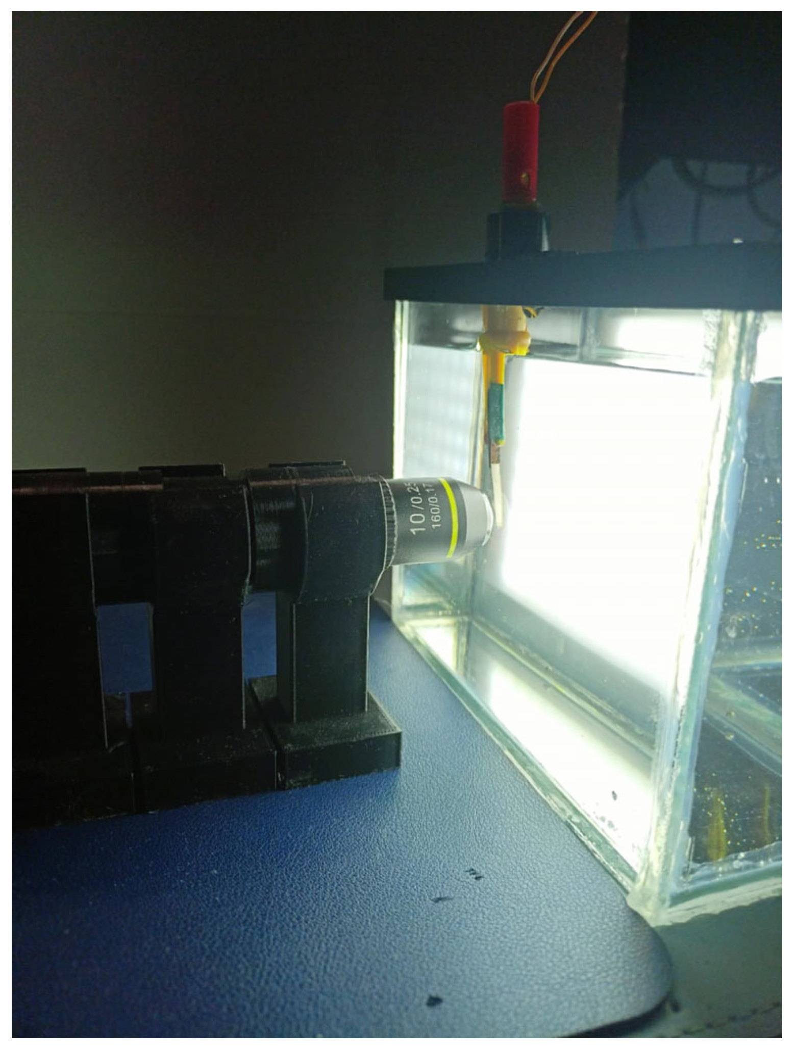 A custom-designed backlight panel was installed on the opposite tank wall and aligned directly behind the sample relative to the camera, covering its full external area (7 cm × 12 cm) consisting of a 15 × 9 grid of true white LEDs. This setup was essential for proper microscope operation as this type of objective lens needs transmitted light (illumination from behind an object) in order to render images visible. Without backlighting, images captured through viewing paths would appear nearly black due to inadequate light transmission.