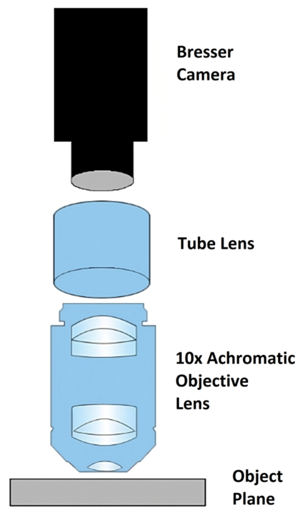 For imaging, the imaging system employed a specially designed tubular microscope with an overall tube length of around 84 mm. It was chosen due to its compact design and ease of alignment along a single optical axis. Equipped with a 10× achromatic objective lens which provided magnification while simultaneously minimizing chromatic and spherical aberrations and keeping distance between objective and IPMC sample within an ideal 7.5–10 mm range due to thickness of glass wall (4 mm) and lens’ ideal focusing range (