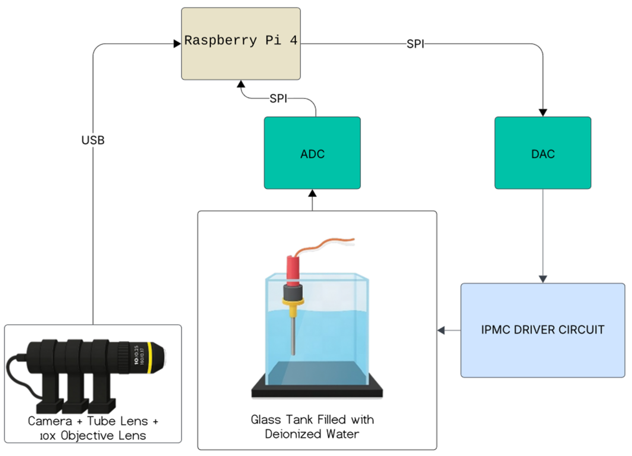 Figure 3 illustrates the block diagram showing the setup of the measurement system designed for simultaneous excitation and monitoring of an IPMC actuator. The signal pathway begins at the Raspberry Pi computer serving as the central control unit. Through the SPI interface the Raspberry Pi sends data to a Digital-to-Analog Converter (DAC) which converts the input into an analog excitation signal. The analog signal produced by the DAC is then directed to a push/pull amplifier for supplying the required current to the IPMC specimen. The left terminal of the IPMC connects to the output of the amplifier whereas the right terminal passes through a 1 Ω shunt resistor, which is used to measure the current, in operation. The voltage drop across the shunt is sent to an Analog-to-Digital Converter (ADC) which converts the analog voltage into a signal for transmission back to the Raspberry Pi, for data logging and evaluation. At the time a high-definition digital camera captures the mechanical movement of the IPMC viewing the specimen through the wall of the glass tank. The optical setup includes a microscope fitted with a 10× objective lens and an LED backlight system delivering a sharp image of the sample for later image analysis and displacement measurement. The camera is linked to the Raspberry Pi, allowing for the simultaneous collection of both visual and electrical information.
