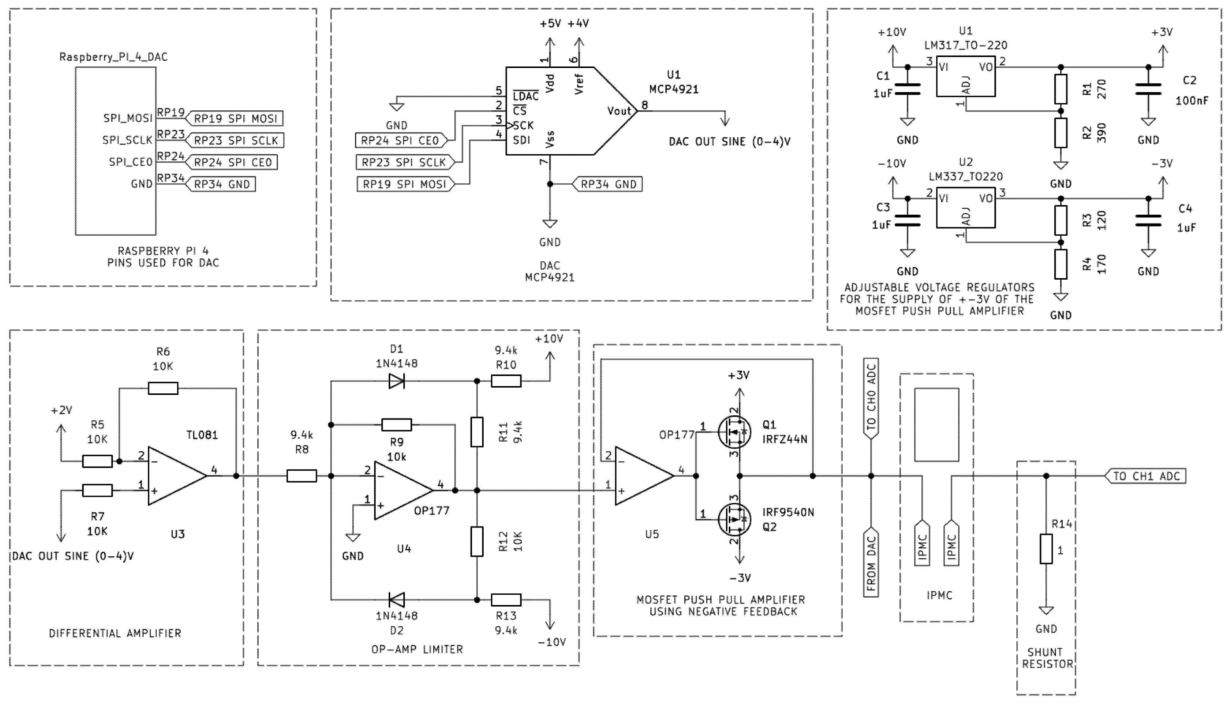 The single-ended sinewave produced by the DAC was first transformed into a bipolar signal centered around 0 V through a differential amplifier, having as a result a waveform in the range of −2 V to +2 V. This signal was then routed to a push-pull amplifier stage consisting of complementary MOSFETs (IRFZ44N for the positive half-cycle and IRF9540N for the negative), powered by a ±3 V supply. To safeguard the IPMC against overvoltage conditions, the driver control circuit incorporates an op-amp-based precision limiter stage. This circuit employs an OP177 operational amplifier in combination with two 1N4148 diodes and a resistor feedback network. Unlike simple Zener limiter configurations, this setup ensures more accurate and symmetrical voltage clamping around the desired threshold, while minimizing distortion in the linear operating region. The limiter effectively restricts the amplitude of the excitation signal before it reaches the push/pull power amplification stage, thereby protecting both the IPMC and the rest circuitry from potentially damaging voltage excursions. The ±3 V supply rails were derived from the ±10 V power source through adjustable voltage regulators (LM317 and LM337) in order maintain stable and safe voltage output levels even in the event of limiter failure.