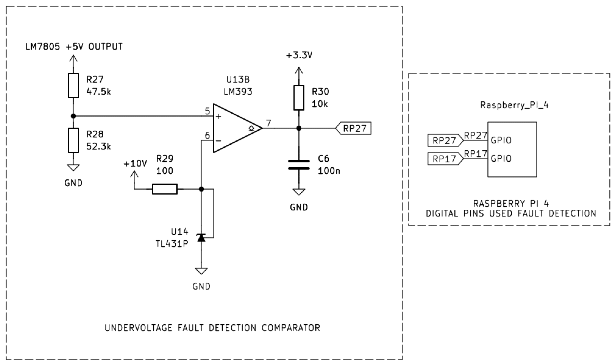 Figure 6 shows the overvoltage detection circuit, the 5 V rail coming from the LM7805 is sensed via a 52.5 kΩ/47.5 kΩ divider. When the output of the LM7805 exceeds the 5.25 V threshold, the divider output rises above the 2.495 V reference voltage and as a result the LM393 output transistor turns off and the open-collector output is being “pulled up” to 3.3 V ensuring a logical HIGH to the Raspberry Pi (RP17), thereby flagging an overvoltage condition.