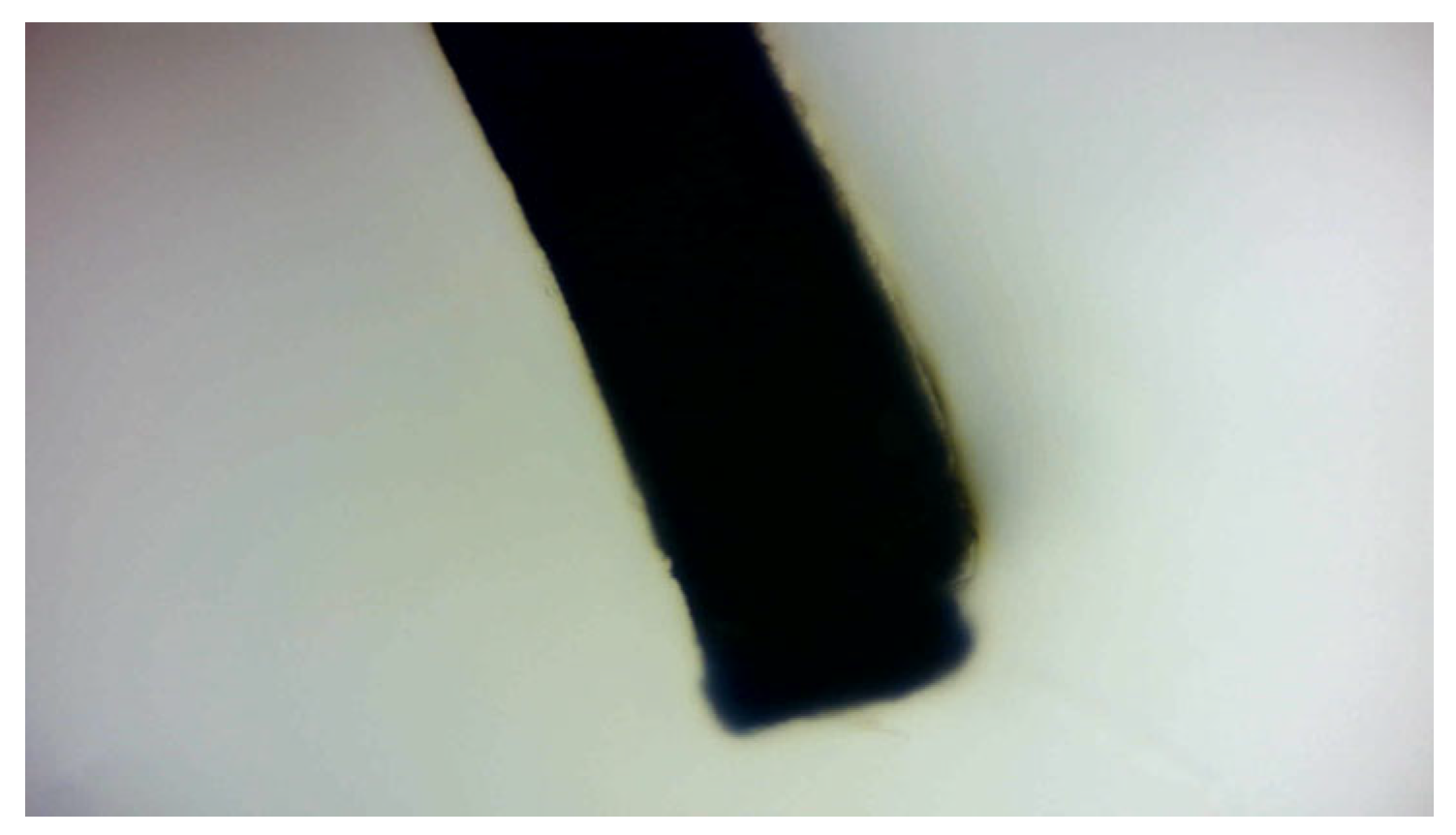 Figure 8 shows a representative frame of the IPMC sample as recorded by the high-resolution microscopy system. The imaging setup enables precise observation of the actuator’s shape, position and bending, providing the necessary basis for edge-detection techniques to identify the free lower tip through image processing.