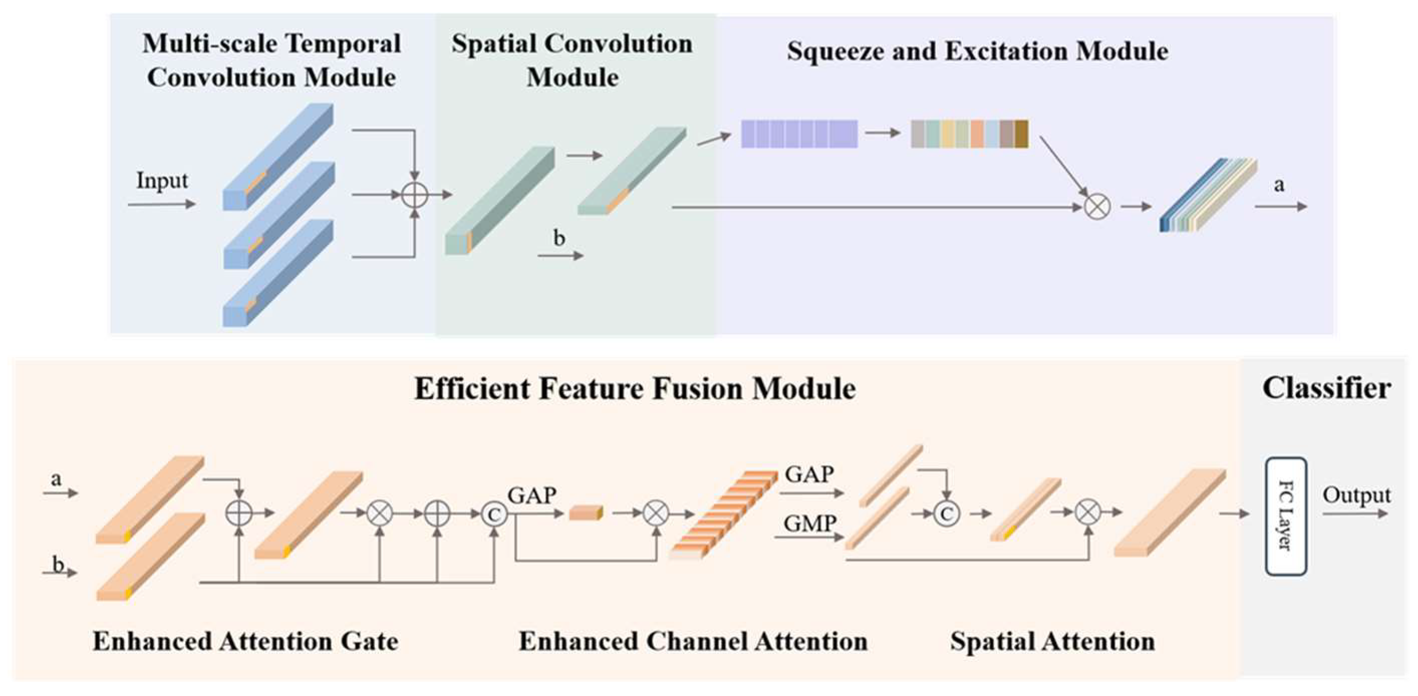 In this section, we propose a novel multi-scale spatiotemporal efficient feature fusion network (MS-TSEFNet), which consists of a multi-scale temporal convolution module, a spatial convolution module, a Squeeze-and-Excitation (SE) module, an Efficient Feature Fusion (EFF) module, and a classifier, as shown in