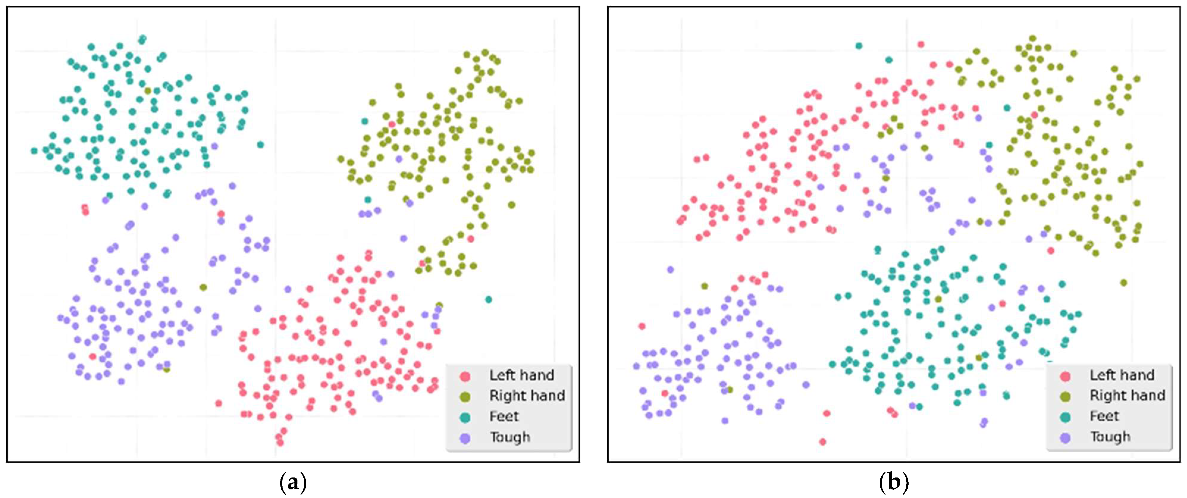Figure 3 illustrates the critical role of the MTC&SE&EFF module in maintaining the discriminative feature distribution. While the full model (a) shows well-separated clusters of all four classes, removing module (b) results in a significant increase in overlap between classes, especially between left-handed and right-handed movements. The Feet and Tongue classes also exhibit a more dispersed distribution and smaller interclass margins. This increase in confusion in the feature space directly corresponds to the performance degradation we observed in our ablation studies, confirming that the integration module is critical to maintaining the uniqueness of the motion-related features in the BCIC-IV2a dataset.