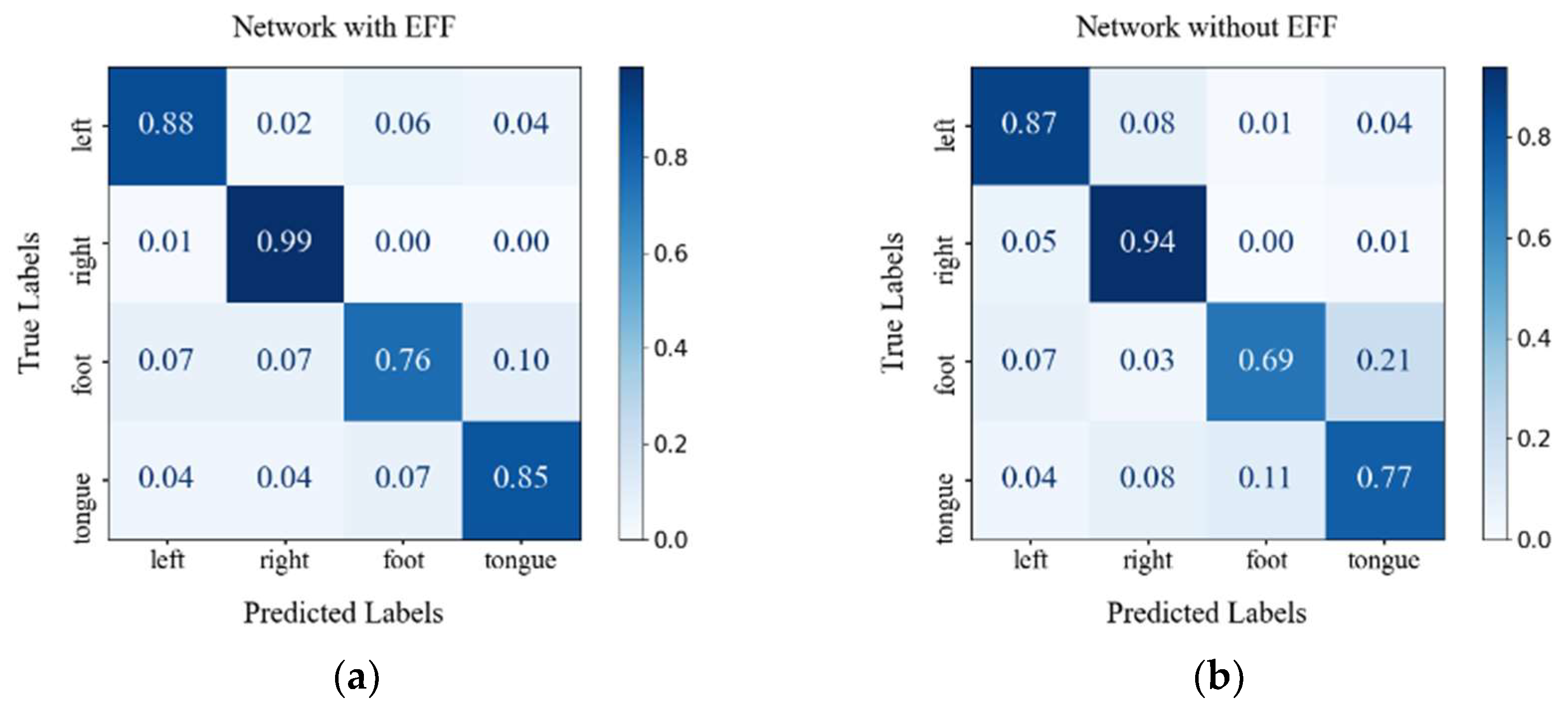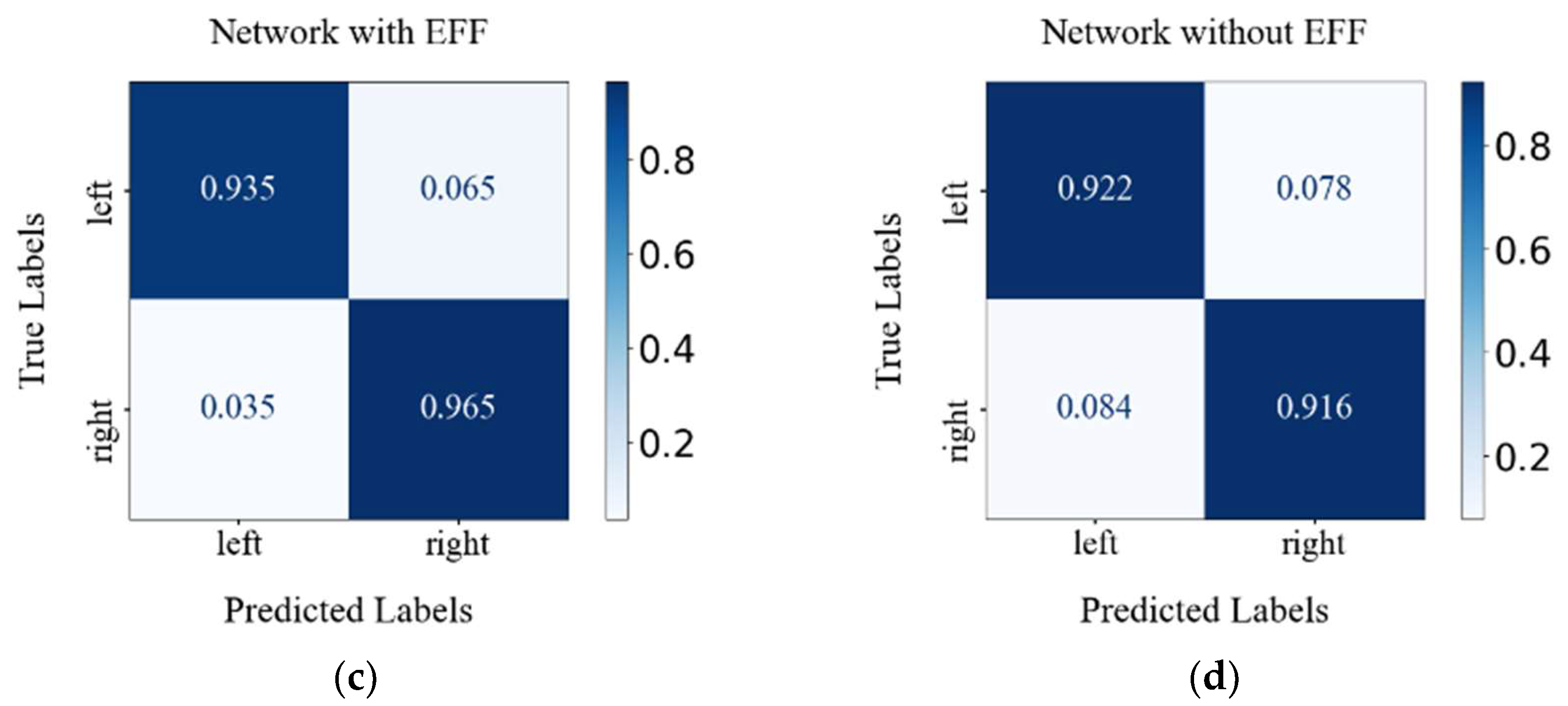 Figure 4; after adding the EFF module, the correct classification rate of the left hand increased from 87% to 88%, and that of the right hand increased from 94% to 99%. Although the improvement is modest, it indicates that the EFF module has a positive effect on enhancing the classification ability for left-hand and right-hand motor imagery. For the foot and tongue motor imagery classification tasks, the correct classification rate increased by more than 7% after integrating the EFF module. This may be because the EFF module better captures and fuses feature information related to foot and tongue motor imagery, further reducing the misclassification rate.