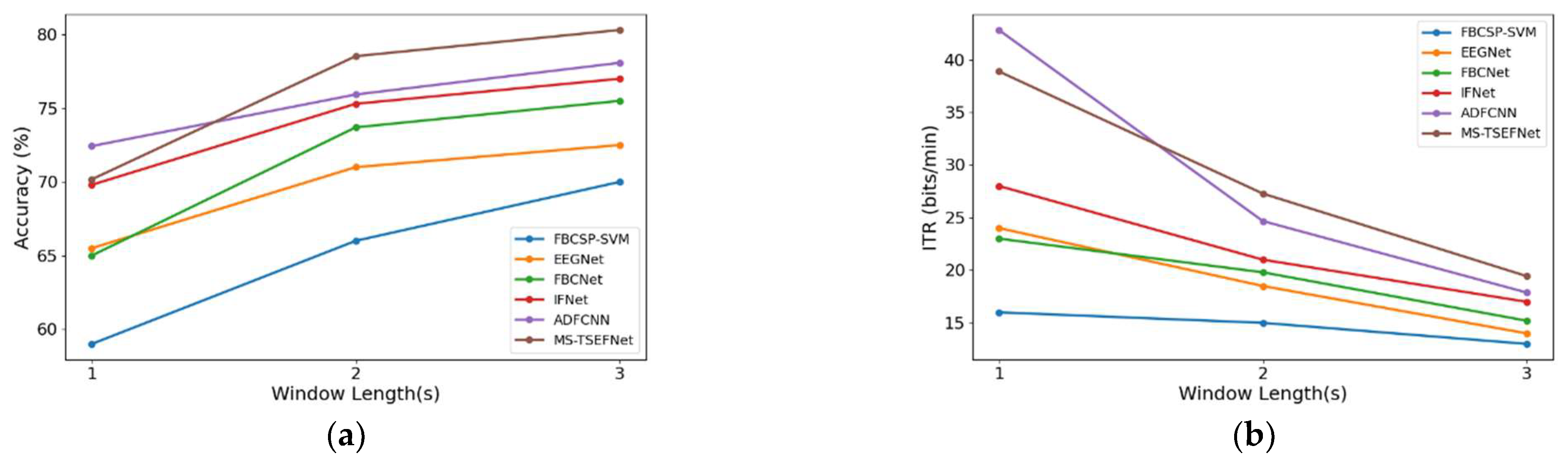 32], EEGNet, FBCNet, IFNet, and ADFCNN models to compare their performance under different time windows. In this study, we selected three different time windows of 1 s, 2 s, and 3 s for experiments. It should be noted that the start time of all experimental data is calculated from 0.5 s after the prompt. For example, a 1 s time window means that we use data between 0.5 s and 1.5 s after the prompt. The ITR calculation as shown in Equation (6).