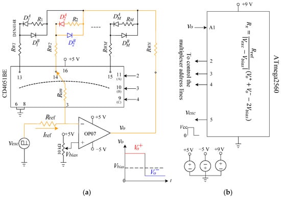 Proposed readout architecture for multiplexed resistive sensors. (a) Circuit configuration employing an inverting op-amp, diode steering, and unidirectional square-wave excitation. Each sensor is selectively inserted into the feedback path via analog switch, enabling accurate two-wire measurement. The op-amp output alternates between two voltage plateaus, and , depending on the conduction phase. (b) Microcontroller implementation, where the digital output generates the excitation signal , the ADC samples the op-amp output during both excitation phases, and the select lines address individual sensors. The sensor resistance is computed digitally from the sampled plateau voltages.