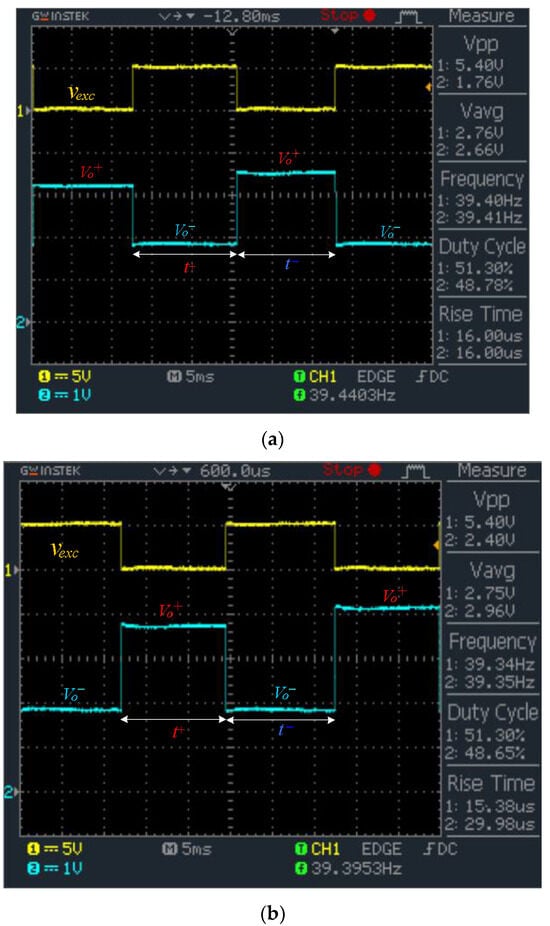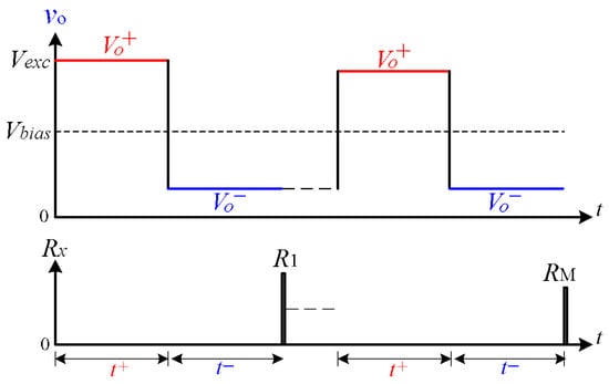 The proposed circuit determines the sensor resistance by analyzing the steady-state output plateaus of the op-amp during two alternating excitation phases. As shown in Figure 2, a unipolar square-wave excitation signal toggles between 0 V and Vcc (e.g., 5 V), producing a constant excitation current through the reference resistor . Although this current remains unidirectional, the diode steering network causes the current through the sensor to alternate direction in each half-cycle.