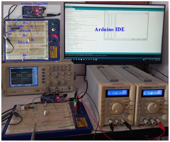 The experimental system was built to validate the proposed resistive sensor array readout method. The main components and configuration details are summarized in Table 1. The setup emulates practical remote sensing conditions, including lead-wire parasitic resistance and time-multiplexed sensor scanning via analog switches. The Arduino Mega2560 microcontroller serves as the core controller, while an OP07 precision op-amp and CD4051B multiplexer form the analog front-end. Special attention was given to ensuring that the prototype reflects real-world, low-cost embedded deployments. This configuration allows systematic evaluation of measurement accuracy, linearity, and robustness to parasitic effects. A TECPEL DMM8050 multimeter was used to verify the actual resistor values used as sensor emulators. Figure 3 shows the full experimental setup, including the Arduino board, dual ±5 V power supplies, oscilloscope used to monitor waveforms, and the PC running the Arduino IDE to log computed resistance values.