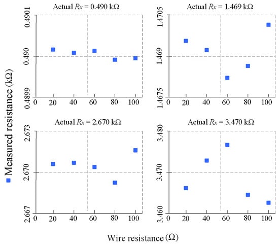 To evaluate the immunity of the proposed method to parasitic lead-wire resistance, additional experiments were conducted by varying the wire resistances and from 20 Ω to 100 Ω in 20 Ω steps. Four different sensor values were tested: 0.49 kΩ, 1.469 kΩ, 2.67 kΩ, and 3.47 kΩ. In each case, the measured resistance was computed from the sampled output voltages using Equation (3) and compared to the actual sensor value. Figure 6 presents the results.