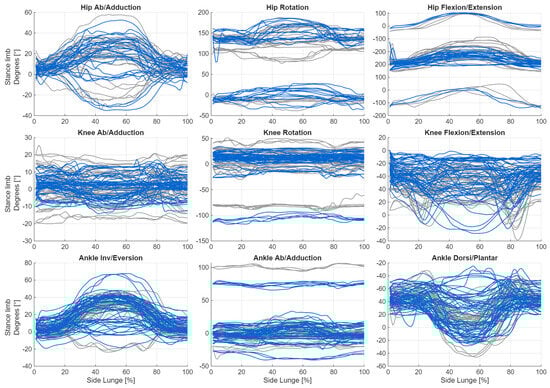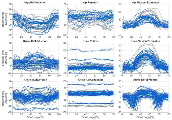 Plot of changes in joint angle values during the execution of the lateral lunge for the stepping limb, shown separately for consecutive repetitions (blue: incorrect, grey: correct).