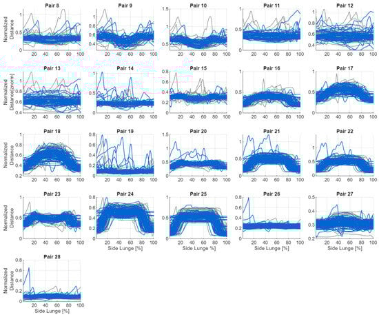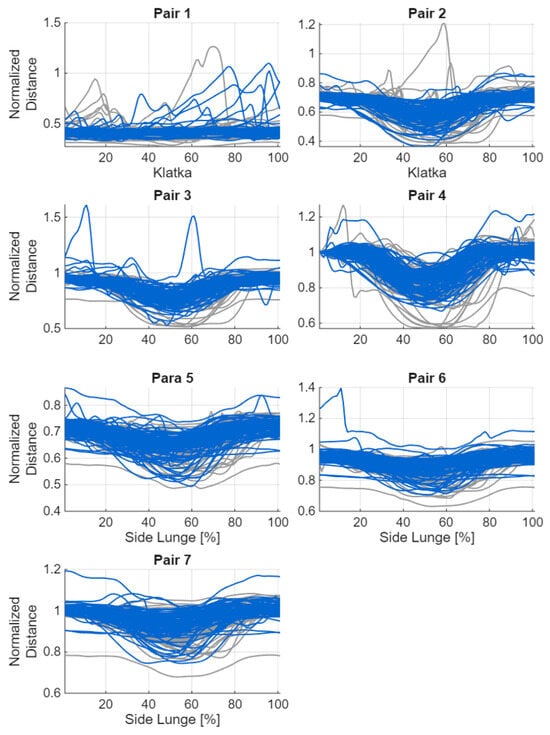If the coordinates of any of the sensors contained a NaN value, a missing value was assigned to the corresponding sensor pair and frame. To limit the impact of anthropometric differences, all distances were normalised relative to a reference distance—the distance between the goggles and the foot of the leading limb in the first frame. When the coordinates of this foot contained NaN, the distance between the goggles and the supporting foot was used instead. All spatial values were then divided by this reference distance to obtain a comparable scale across participants. All 28 possible sensor pairs were analysed, including the seven trackers on the lower limbs and the goggles (Table 2). Hand trajectories were excluded because the subjects did not receive clear instructions on upper-limb positioning. Figure 5 and Figure 6 show graphs of the changes in distance between the sensors during the exercise.