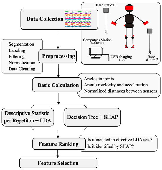 In addition, the classification potential of each feature was assessed using the area under the curve (AUC) of the receiver operating characteristic (ROC), identifying variables that simultaneously met the following criteria: AUC ≥ 0.55, Cohen’s d ≥ 0.5, and p < 0.1. This method identified seven distance features and 117 angular features. Due to the small number of distance features meeting the AUC criterion, feature sets selected on the basis of significance and correlation tests (48 features) were used for further analysis. The final set consisted of statistical parameters derived from angular and distance signals (e.g., ROM, deviations, quartiles, and distribution shape measures), which served as input data for the LDA classification model. Figure 7 illustrates the workflow of the study.