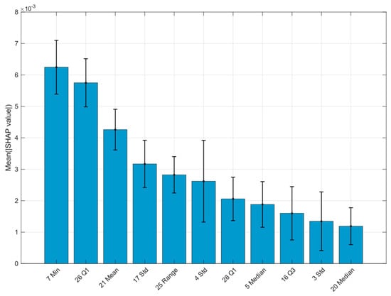 As an illustration of the approach used, a SHAP bar chart (feature importance plot) is presented for the block of distance features with the highest classification effectiveness, showing the global importance of the individual parameters (Figure 8). No analogous visualisations are provided for the remaining blocks, as they do not contribute any additional key information within the adopted framework.