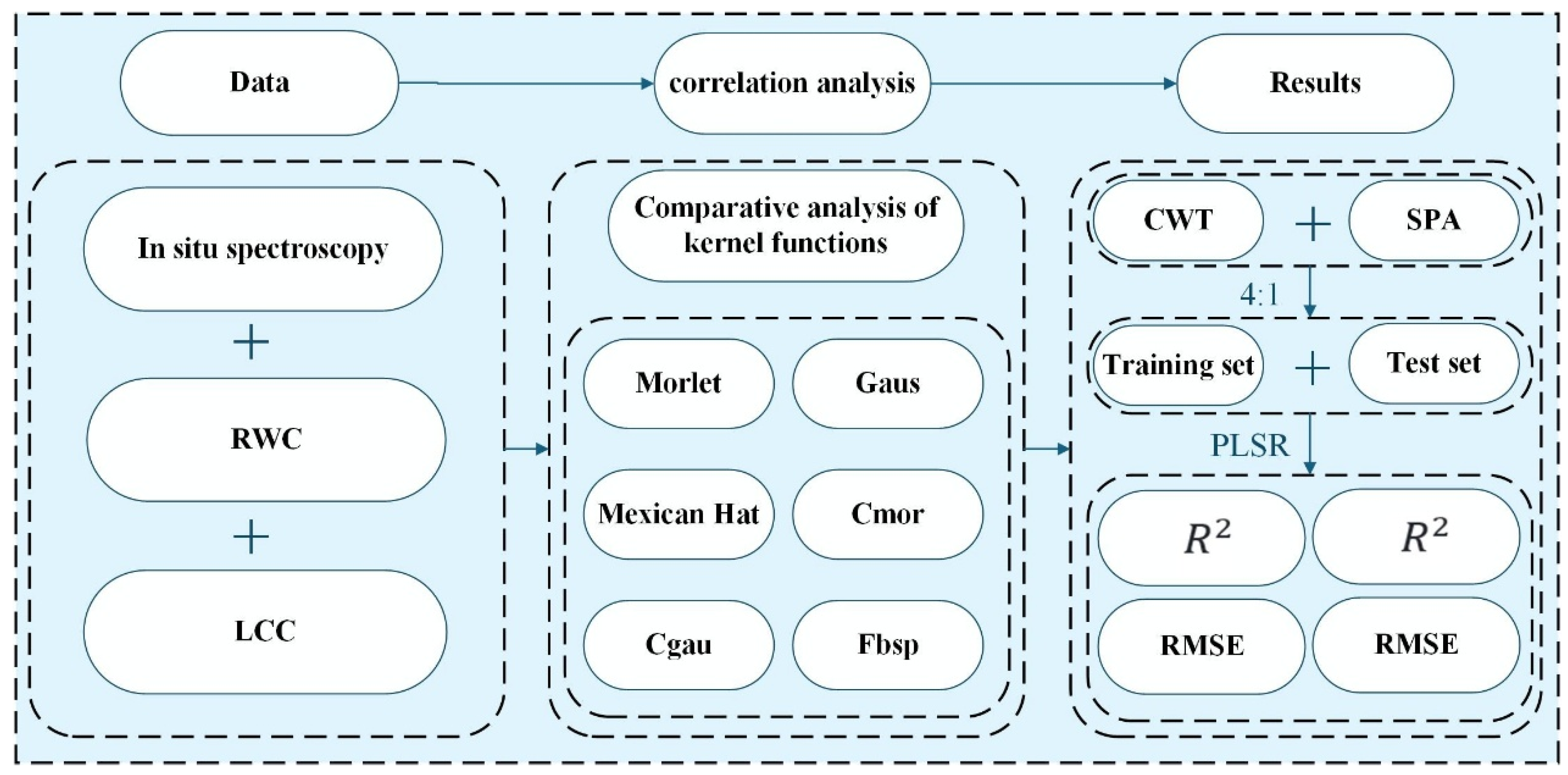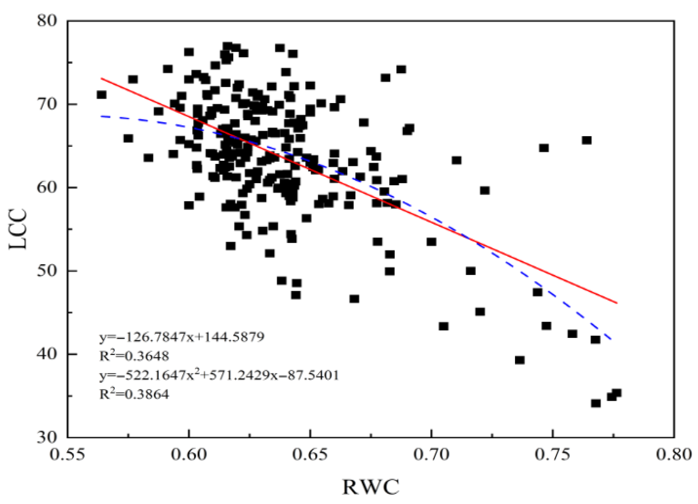 3.1. Correlation Analysis Between RWC and LCC Based on PLSR