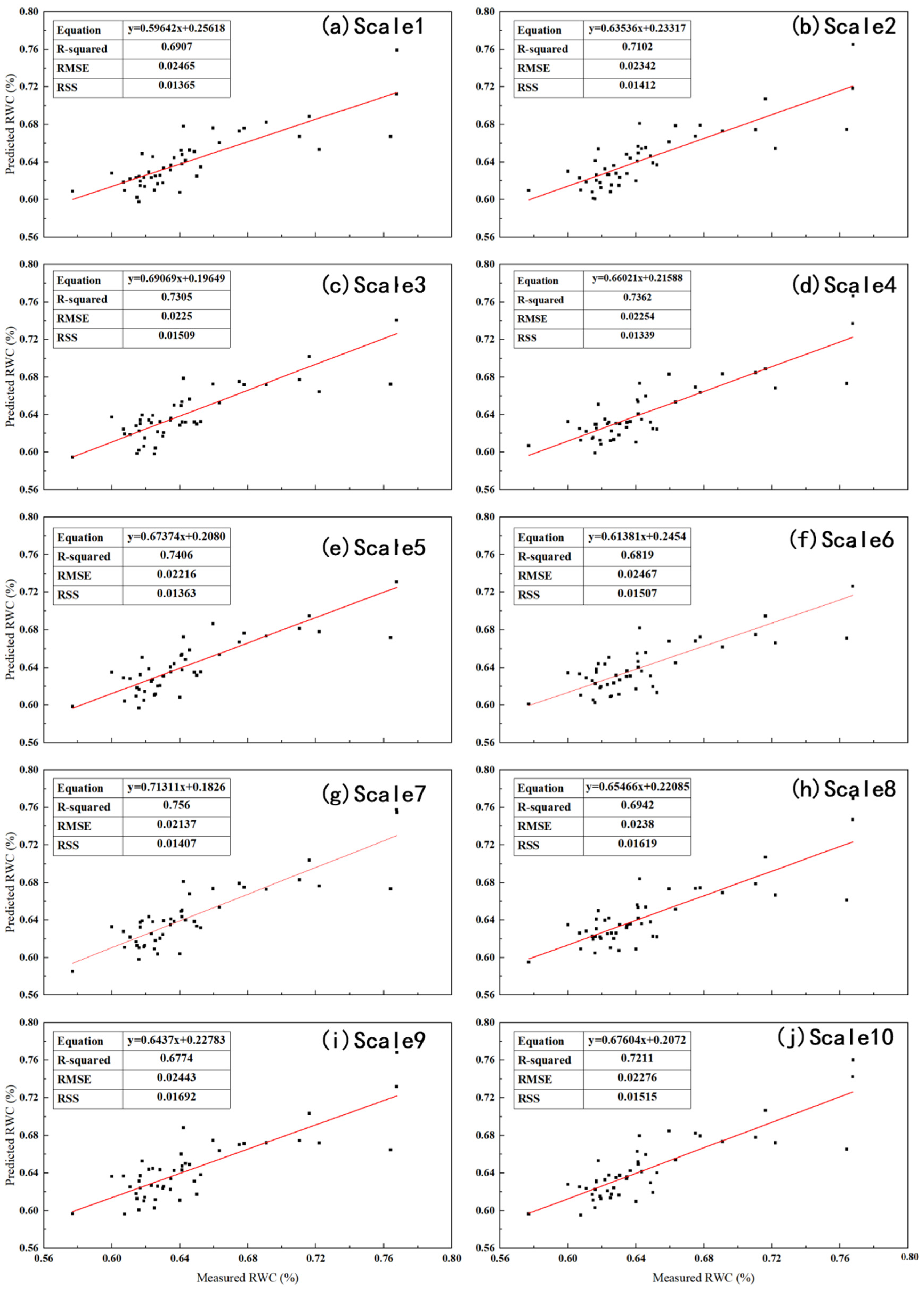 3.5. Analysis of RWC Inversion Results of Citrus Leaves Using RWC–LCC-Sensitive Band Combination