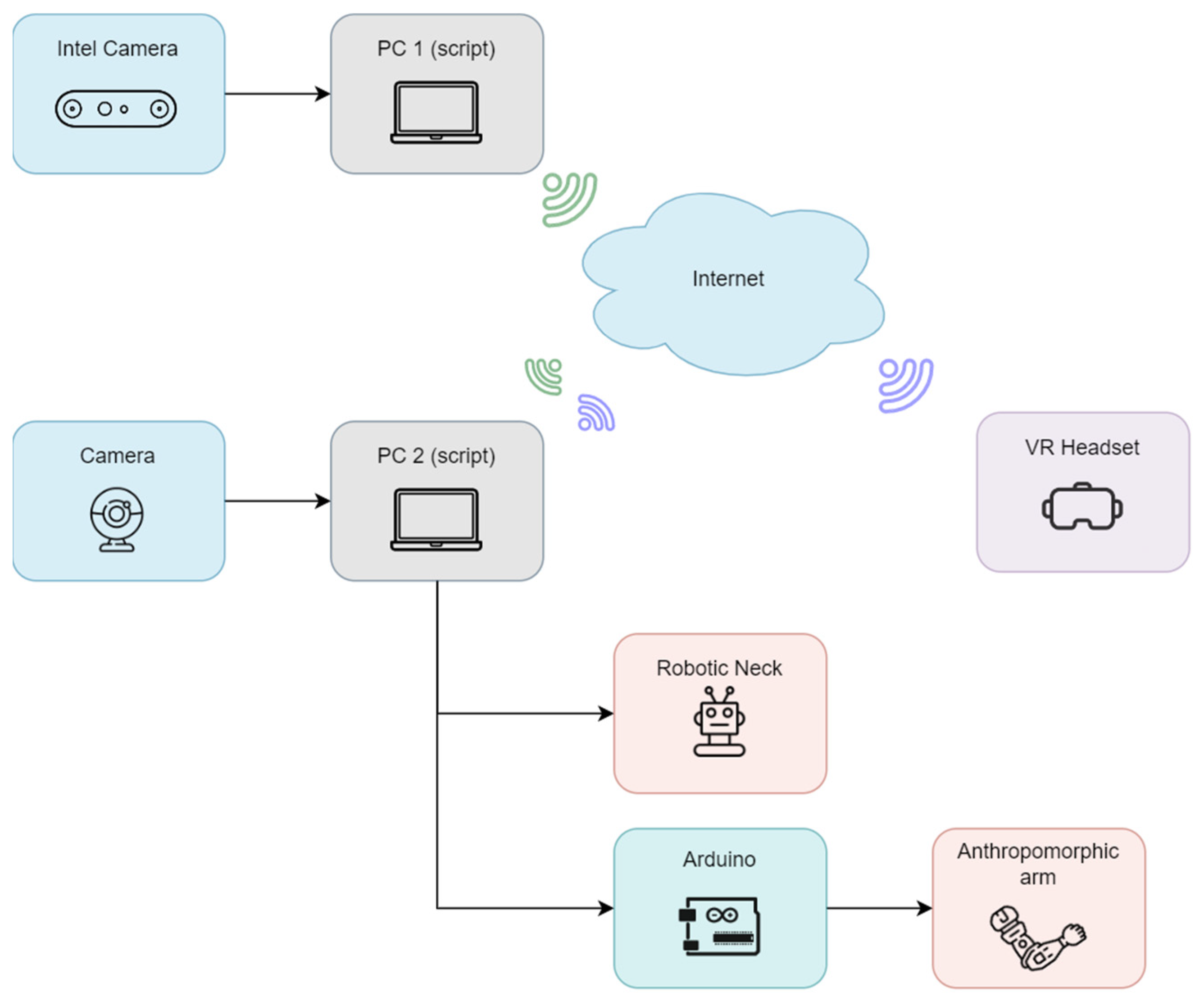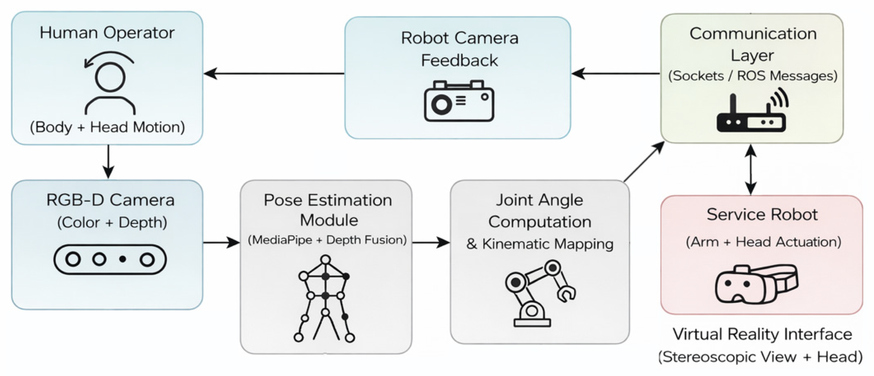 Human motion is captured using an RGB-D camera, providing synchronized color and depth information. A pose estimation module extracts body landmarks and reconstructs the operator’s 3D joint configuration. Joint angles are then computed and mapped to the kinematic constraints of the service robot’s anthropomorphic arm. Control commands are transmitted to the robot through a dedicated communication layer, while visual feedback from the robot-mounted camera is streamed back to the operator. A virtual reality interface provides stereoscopic visualization and head-motion-based view control, closing the teleoperation loop. This modular structure enables clear separation between sensing, processing, communication, and actuation, facilitating system integration and future extensions.