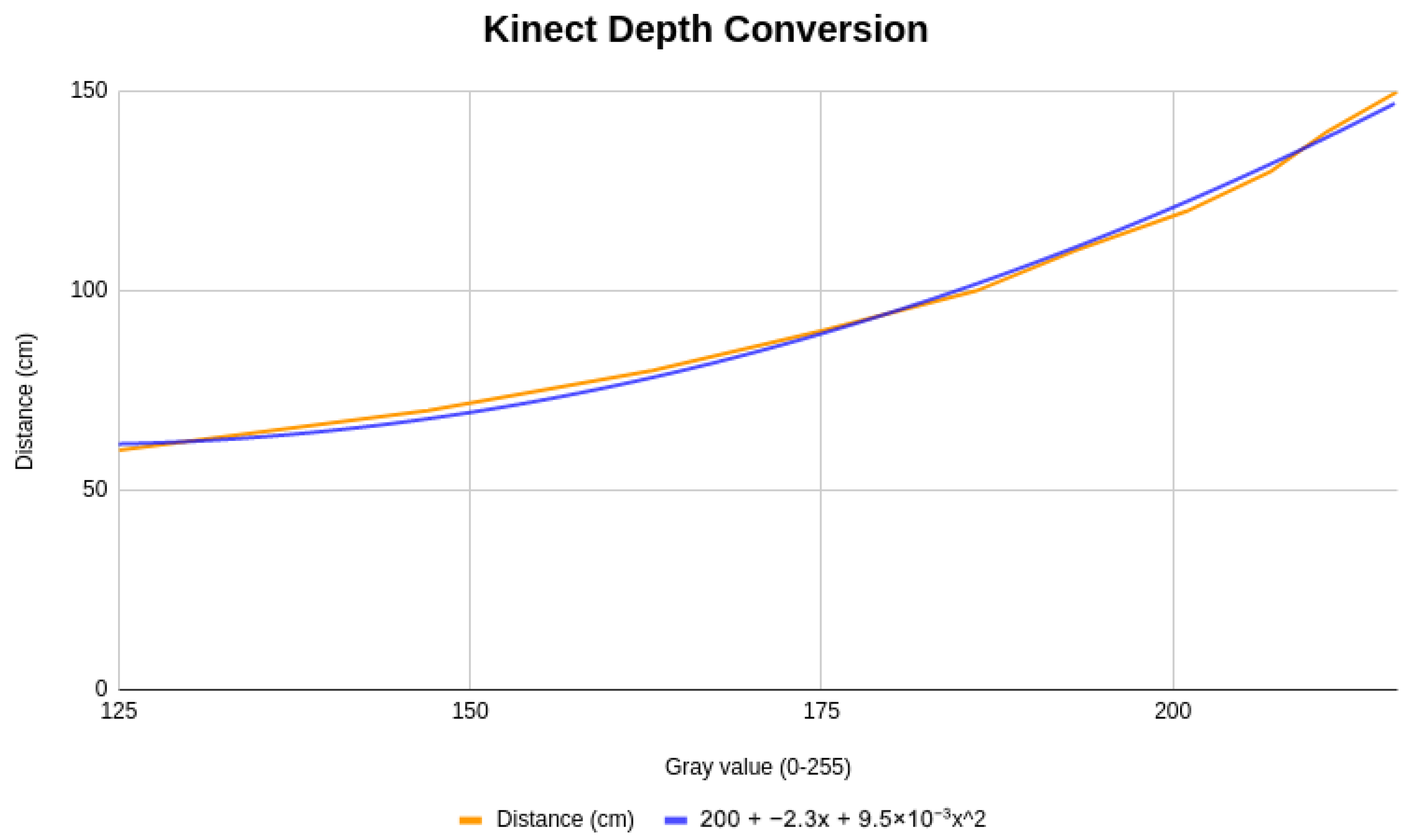 ® RealSense™ D455 offers a built-in method, get_distance(), which provides direct access to depth measurements in meters. This functionality simplifies the acquisition of reliable depth data, streamlining the mapping process between human and robot kinematics. In contrast, the Microsoft Kinect requires a more elaborate calibration procedure. Depth information must be inferred by converting grayscale intensity values into metric distances, which involves collecting reference measurements at multiple points and fitting a calibration curve. This calibration process is illustrated in