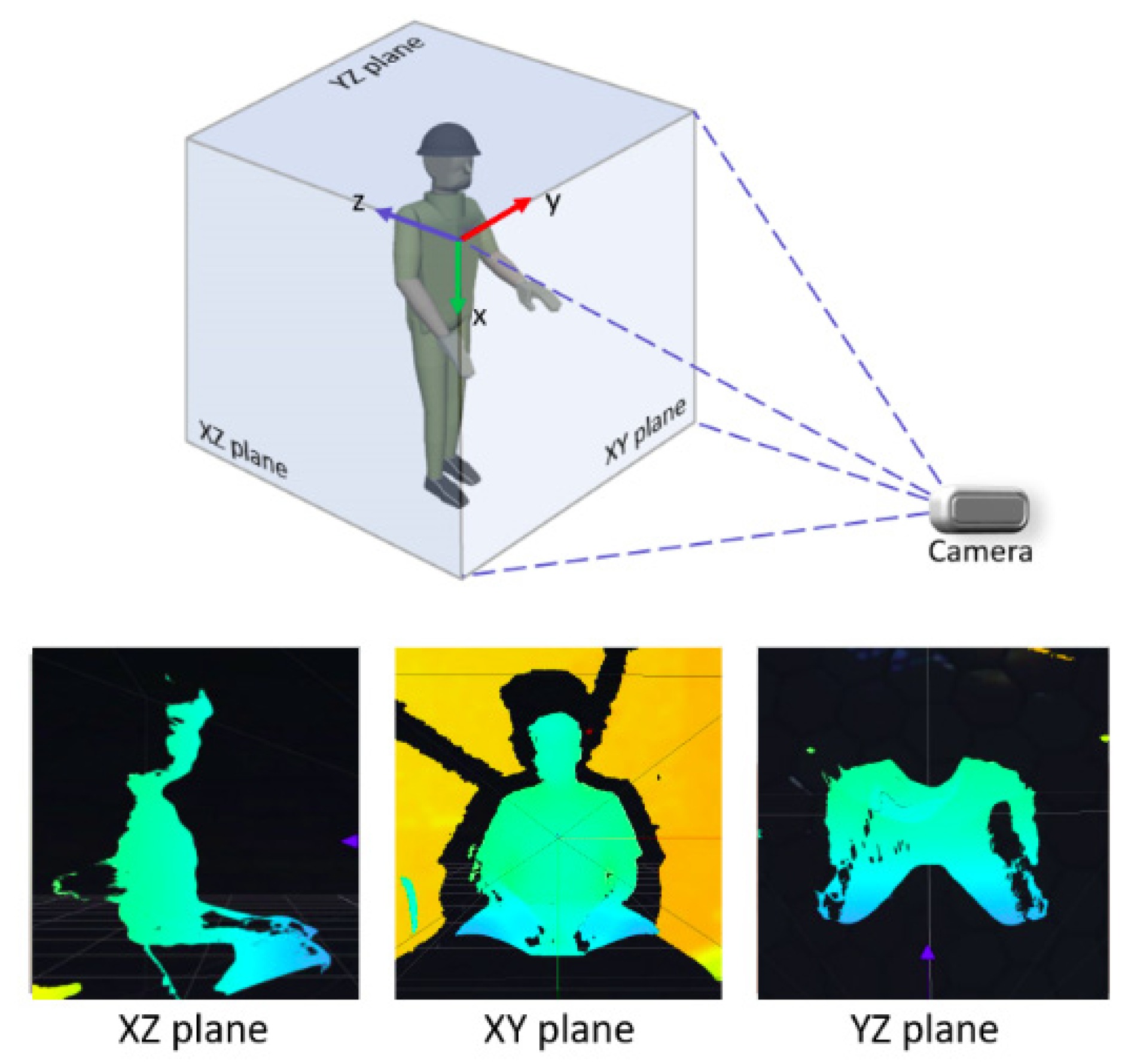 In certain scenarios, full 3D computation may not be necessary. For example, shoulder pitch can often be resolved within a 2D projection. To streamline computations, the 3D coordinates of joints can be decomposed into orthogonal planes—XY (frontal), YZ (lateral), and XZ (top)—allowing targeted analysis of specific movements. This projection-based strategy, illustrated in