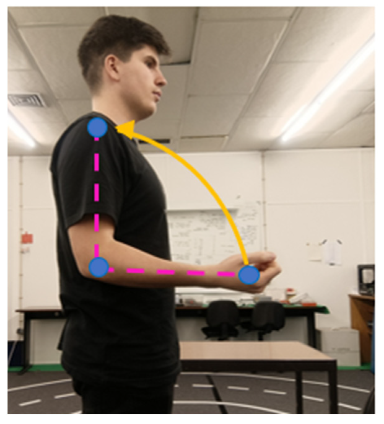 A known limitation of this method arises when the elbow is positioned significantly forward relative to the shoulder. Under these circumstances, the scalar product may yield an incorrect value due to the influence of depth disparity. To compensate for this, a corrective factor based on the difference in depth (z) between shoulder and elbow is introduced. The adjusted shoulder roll is given by: